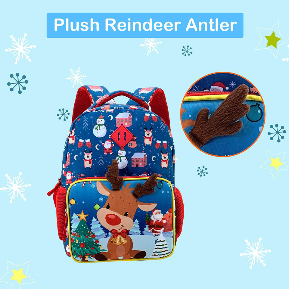 ⭐【Christmas Gift Plush Antler School Backpack】: Kids backpack with reindeer and Santa Claus pattern on the front pocket by plush antler. It is cute and attractive for little girls and boys in kindergarten or elementary school ages 3-8 years old.