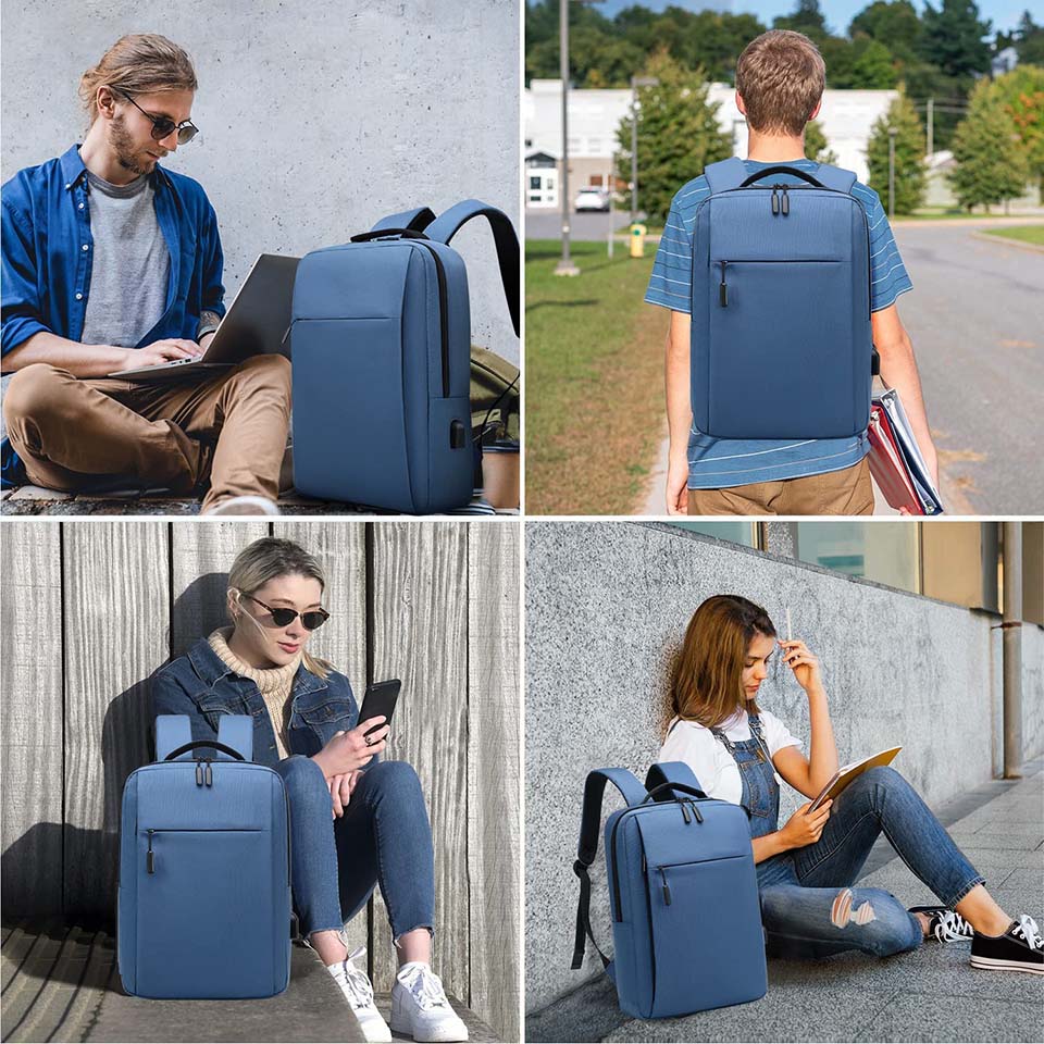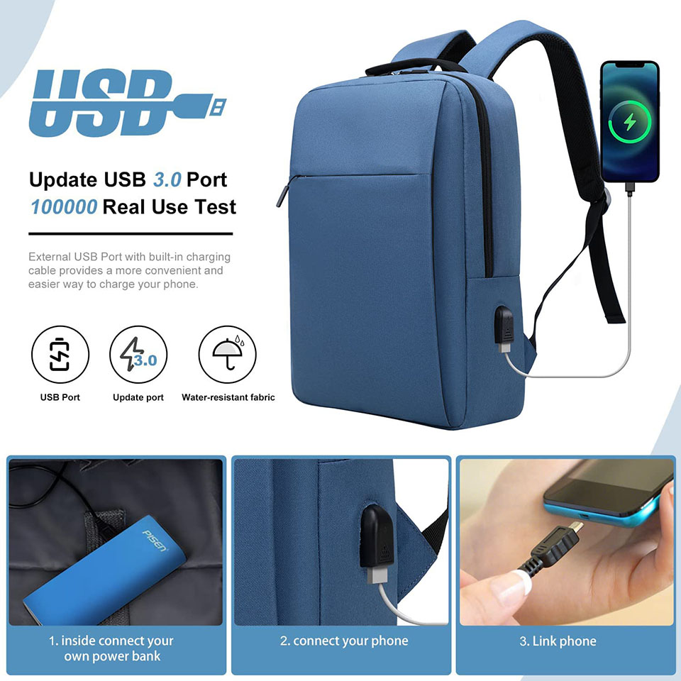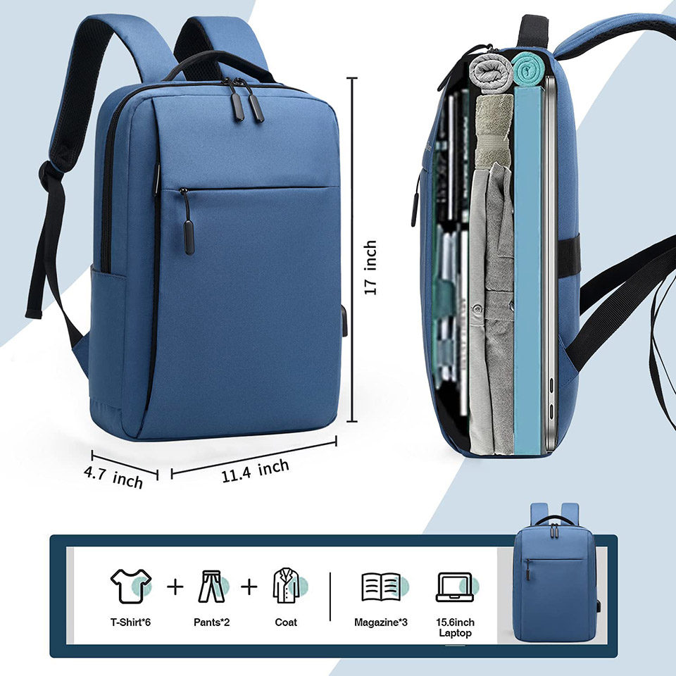 【STORAGE SPACE&POCKETS】One separate laptop compartment holds 15.6 Inch Laptop as well as 15 Inch,14 Inch, and 13 Inch Laptop. One spacious packing compartment roomy for daily necessities, tech electronics accessories, and a bunch of other items, make your items organized and easier to find. 【FUNCTIONAL】A luggage strap allows the backpack to fit on luggage/suitcase, and slide over the luggage upright handle tube for easier carrying. Well made for international airplane travel and day trips as a travel gift for men. this USB backpack offers you a more convenient way to charge your phone while walking. Please noted that this backpack doesn't power itself, the USB charging port only offers easy access to charge. When cleaning the backpack, remove the USB charging line. metal zippers. Ensure secure & long-lasting usage every day & weekend. Serve you well as a professional office work bag, slim USB charging backpack, and college backpack for men and women. bottle, readers and a bunch of other items, iPad, journal, pens and pencils, iPhone. The Notebook Computer Bag Side pocket accommodates compact umbrellas and other small items.