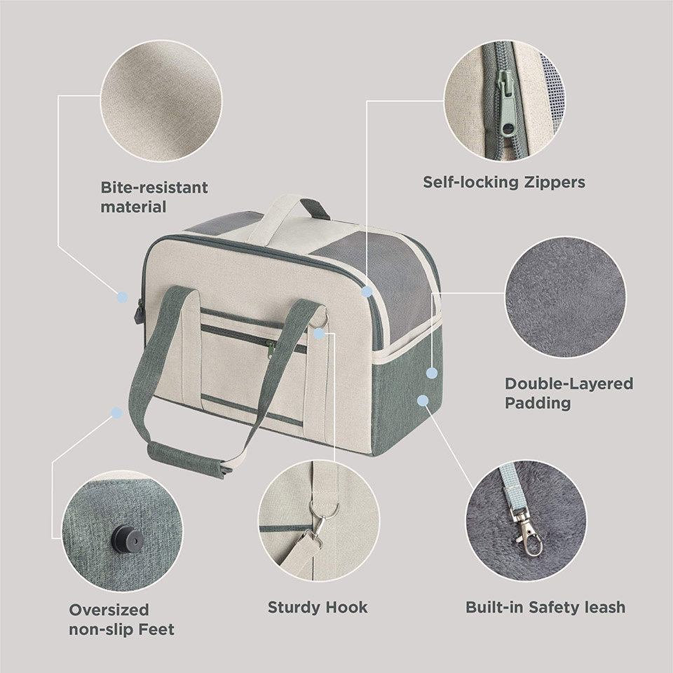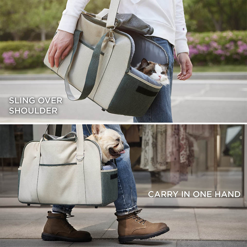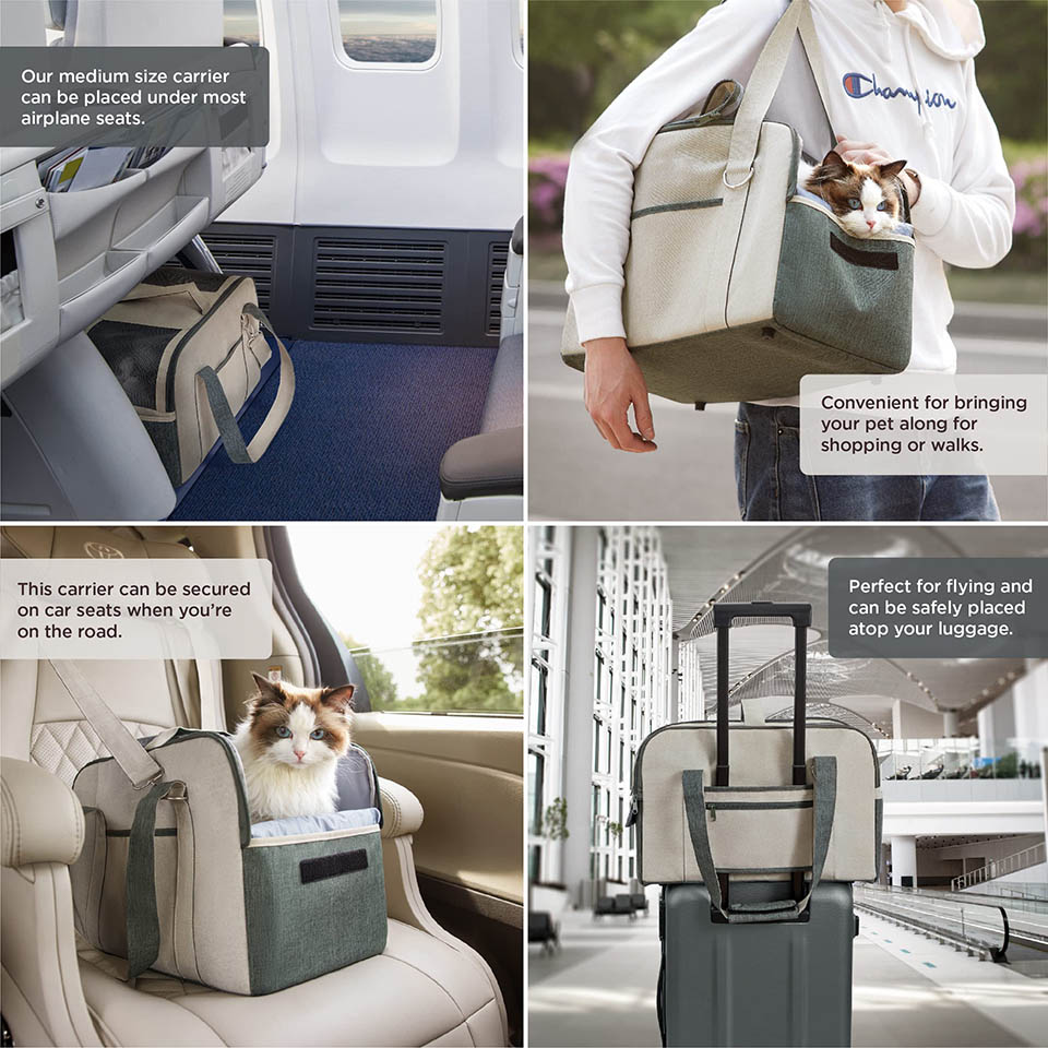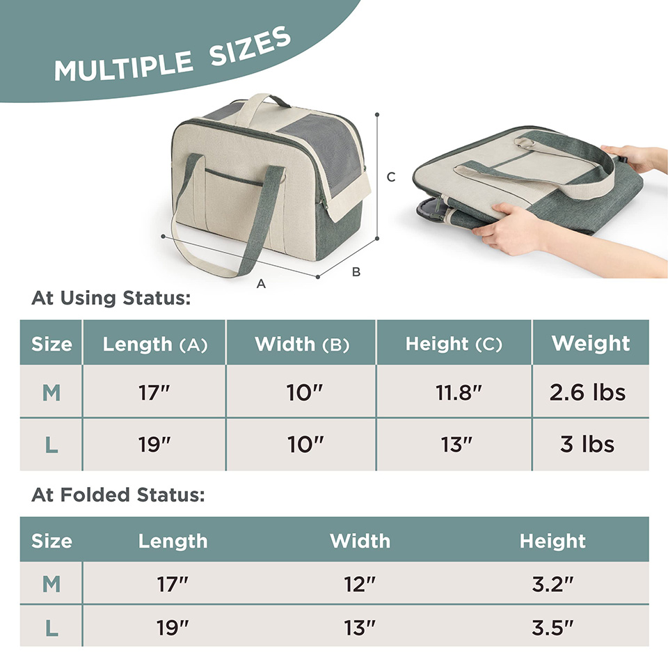 * Airline-Approved: Our TSA-approved pet carrier is perfect for taking your fuzzy companion aboard a plane when you’re heading out of town. With our small dog carrier airline approved, you can give your pet a safe space for journeys while being compliant with TSA regulations. * Versatility: Our pet carriers for small dogs or cats allow you to carry your precious cargo by hand, cross-body or slung over one shoulder. High-quality metal hooks, a self-locking zipper, and a safety leash ensure the utmost security. * Multi-functional: Our cat or dog travel carrier has multiple pockets for storing essentials and is designed so the shoulder straps can double as a temporary leash, providing a quick way to let your pet take a break outside while on-the-go at the airport. * Multiple Sizes: Our small dog carrier comes in two sizes – size medium (TSA-approved) measures 17x11.8x10" and size large measures 19x13x10''. This soft pet carrier is machine-washable for easy care. |
