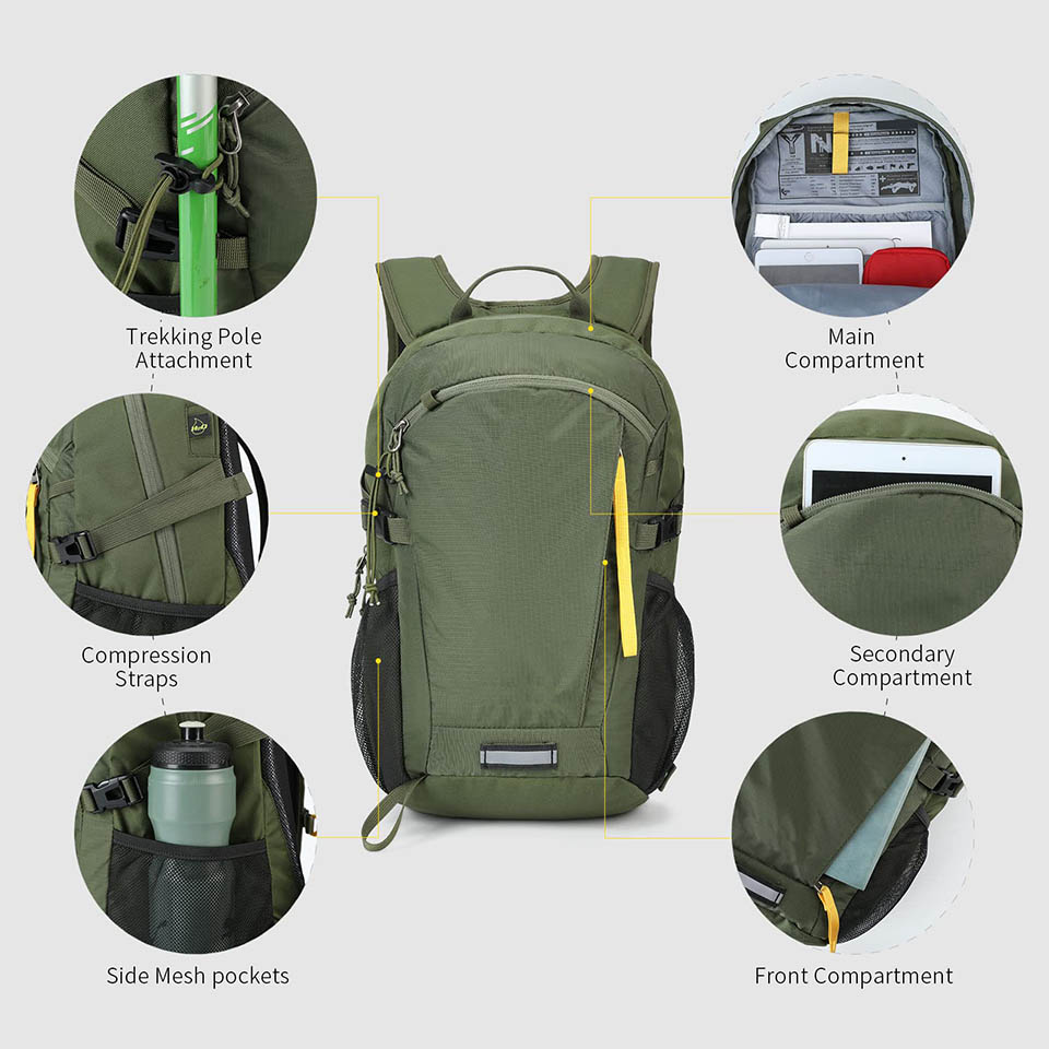 WATER-RESISTANT AND DURABLE MATERIAL: The 20l Hiking Backpack is made of high-density 600D polyester and 210D nylon plaid fabric, which is impermeable, water-resistant, tear-resistant, and wear-resistant. All of the backpack's stress points and shoulder straps are reinforced with lap knots to ensure long-lasting durability.