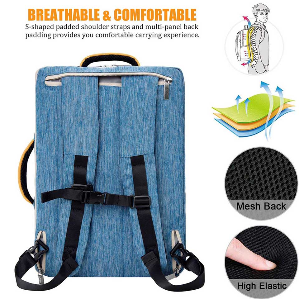 with adjustable and detachable shoulder strap, the bag can be used as backpack, business briefcase, or travel handbag. Perfect for any situation, this sleek design keeps you moving in style during your commute, work, school, college, travel, etc. * MULTI-COMPARTMENT ORGANIZER: One large compartment with separate laptop pocket and tablet pocket. The main multi compartments can accommodate lots of stuffs like college supplies, travel accessories, clothes, stationery, notebook, cord organizer. Front zipper pockets conveniently hold travel gear umbrellas or water bottles. External headphone/cable port for easy connection. * DURABLE MATERIAL: This Computer laptop bag is made of high quality WATER RESISTANT durable terylene fabric with metal zippers, smooth, flexible, portable and easy to clean. Ensure a secure and long-use durability. Thick foam padded compartments with polyester lining protect your valuable devices against dust, wet, shocks and bumps. Serve its purpose as professional backpack for work, travel, business, school or outdoor activities. * COMFORT & CONVENIENCE: Ergonomic adjustable straps and dual sturdy wrapped bale handles for comfortable use. Detachable shoulder strap with thick and wide pad to relieve the stress of shoulder. Great briefcase laptop handbag messenger business bags for men and women. * DIMENSIONS: External Size: 15 x 11 x 3 inch. Internal Size: 14 x 10 x 2 inch. |