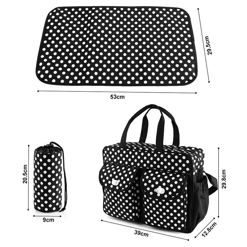 Description:Ultra light weight Organizing Mommy Diaper Bag Color:Polka dots Dimension:18"L x 6"W x 12.75"H Lining:210D