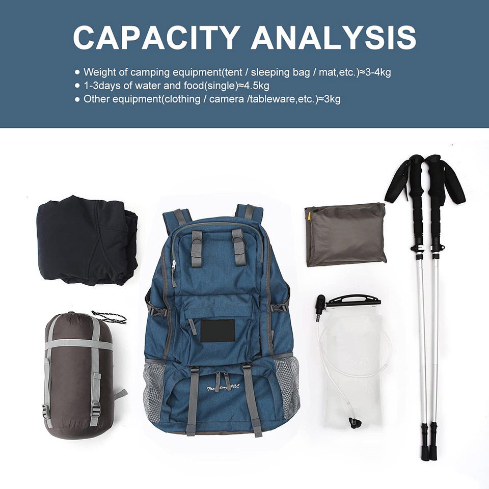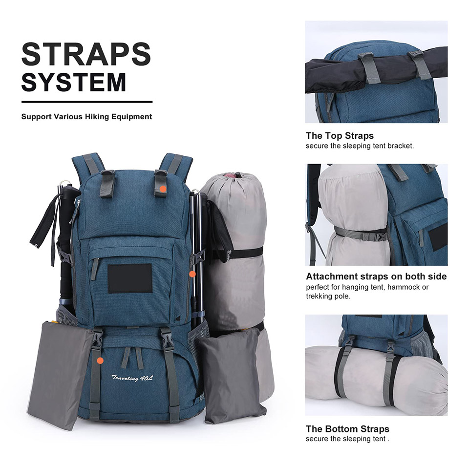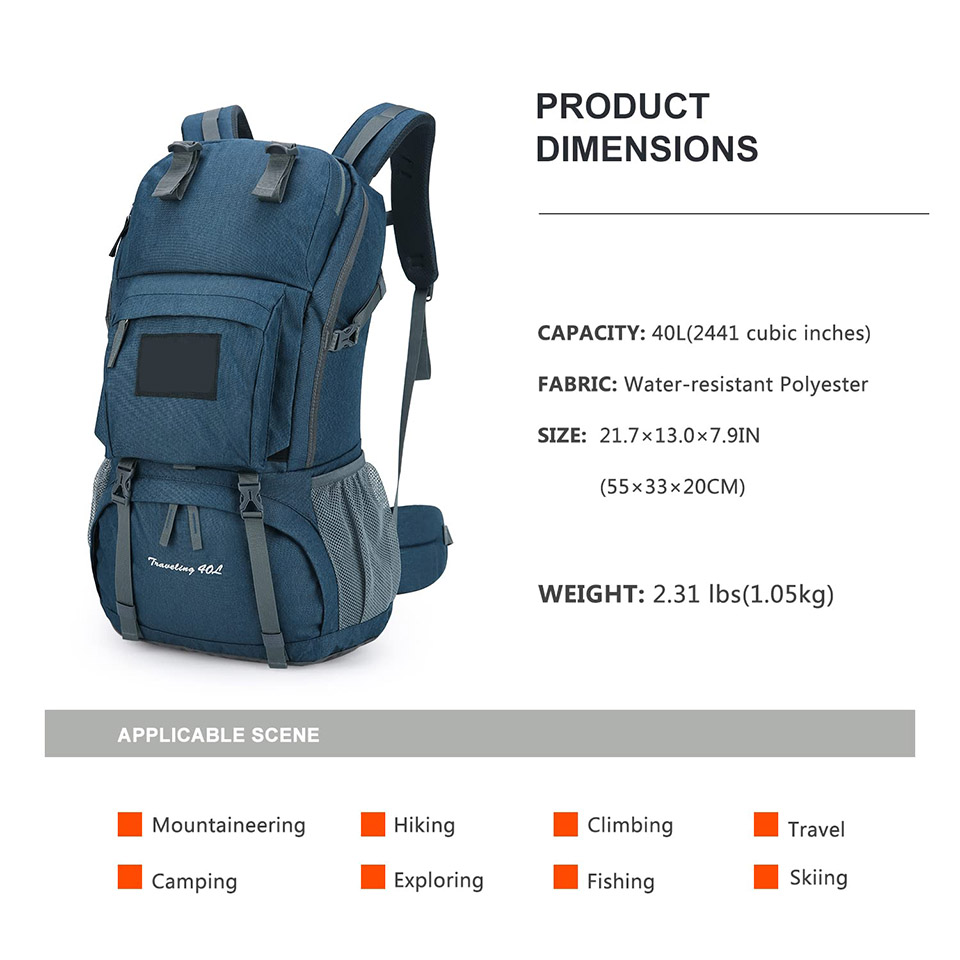 Essential details Application: Outdoor, Sport, Travel, Hiking, Camping Material: Polyester Capacity: 40L Color: Customized Certificates: BSCI,Sedex,TUV,ISO9001 Sample time: 5-7 Days Warranty: 1 year against defect of materials and manufacturing OEM/ODM: Acceptable MOQ: 500pcs read More