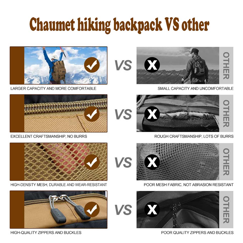* \uD83D\uDD50【HIGH QUALITY & DOUBLE WATERPROOF BACKPACK】: Our Hiking Backpack is made of sturdy ripstop water-resistant Polyester Material. durable zipper, well-sewn craftsmanship, high dense stitching. Built with strong stitching in the places you need it such like the shoulder straps, carrying handle, bottom and other places. With waterproof rain cover for free prevents your outdoor gear from getting wet in drizzle, not afraid the rain anymore.