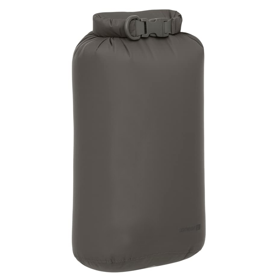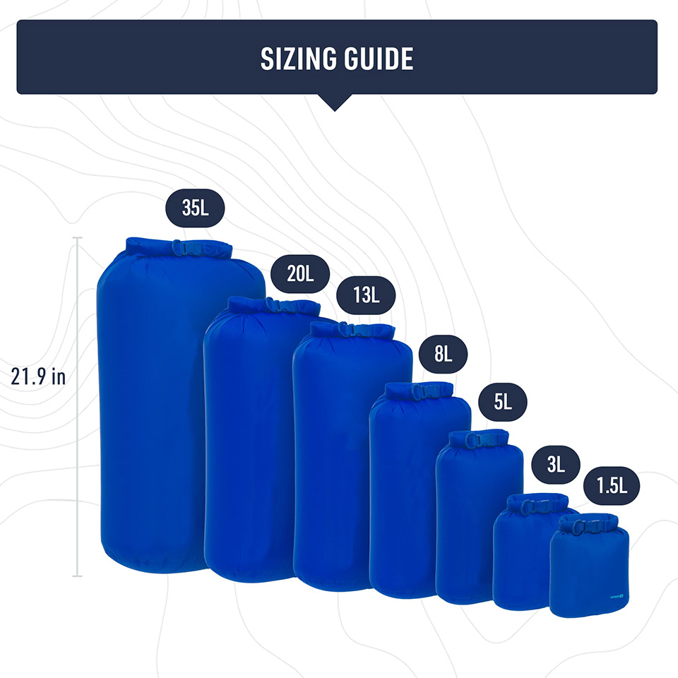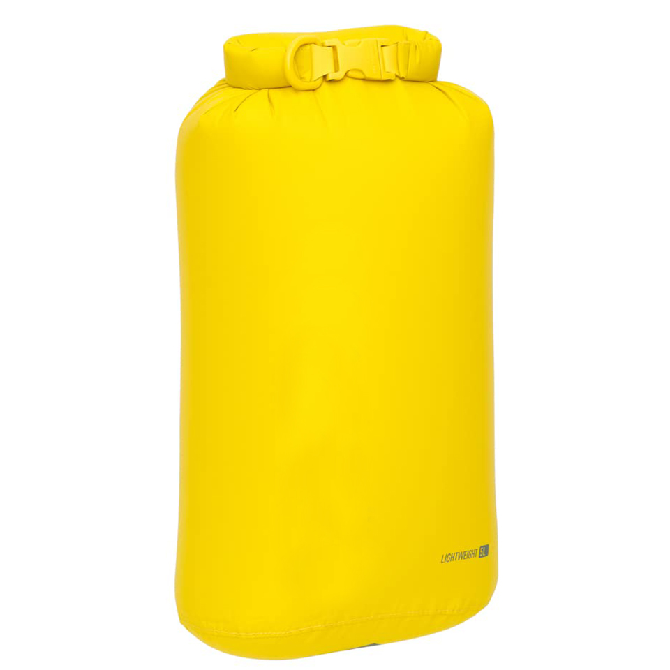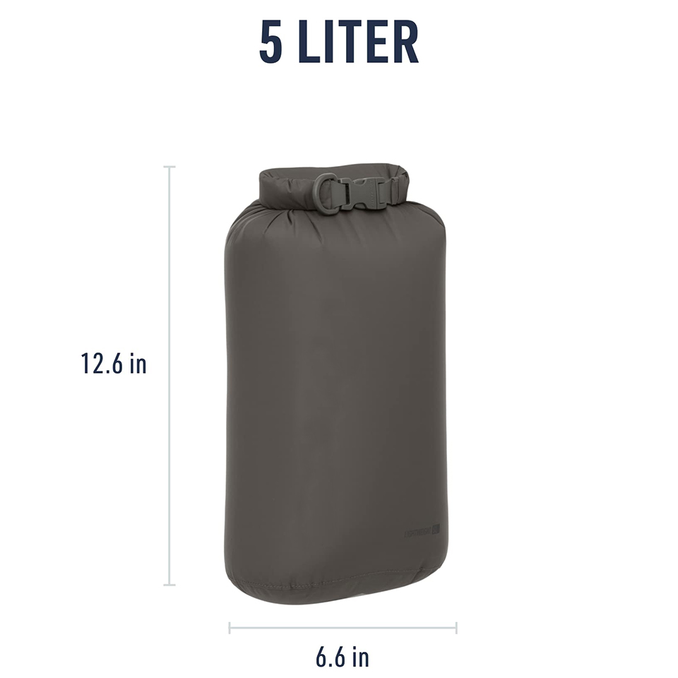 The lightweight 5-liter roll-top dry bag is a classic, versatile dry storage and organizing option for backpacking, hiking, camping, sea kayaking, ski touring, cycling, and travel Manufactured from lightweight PU-coated 70D nylon with a DWR finish; secure roll-top closure; interior polyurethane coating is white to improve visibility into bag contents buckle can be replaced in seconds 5 liters (with closure rolled three times)