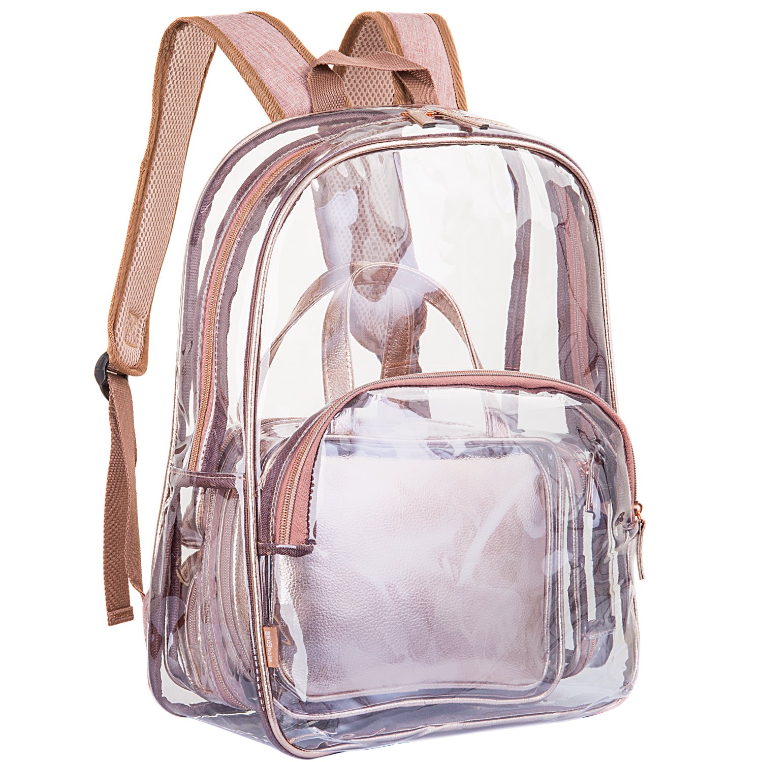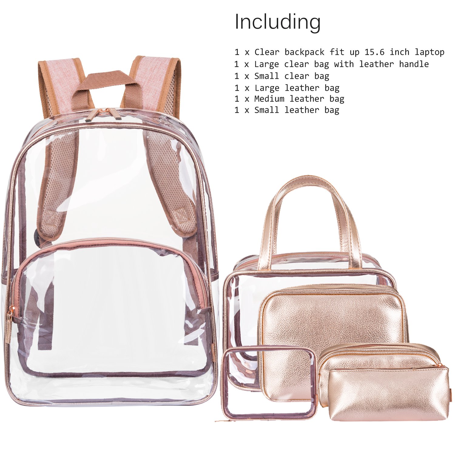 Made of Eco-Friendly PVC material 1 x Clear backpack fit up 15.6 inch laptop: 16.5" x 6" x 12"; 1 x Large clear bag with leather handle: 9.5" x 4.8" x 7"; 1 x Small clear bag: 6.3" x 2" x 5.2"; 1 x Large leather bag: 9" x 2.3" x 6.5"; 1 x Medium leather bag: 8.3" x 2.7" x 4"; 1 x Small leather bag:7.5" x 3" x 3.5".Great size and enough space to pack different type of travel/school accessory.