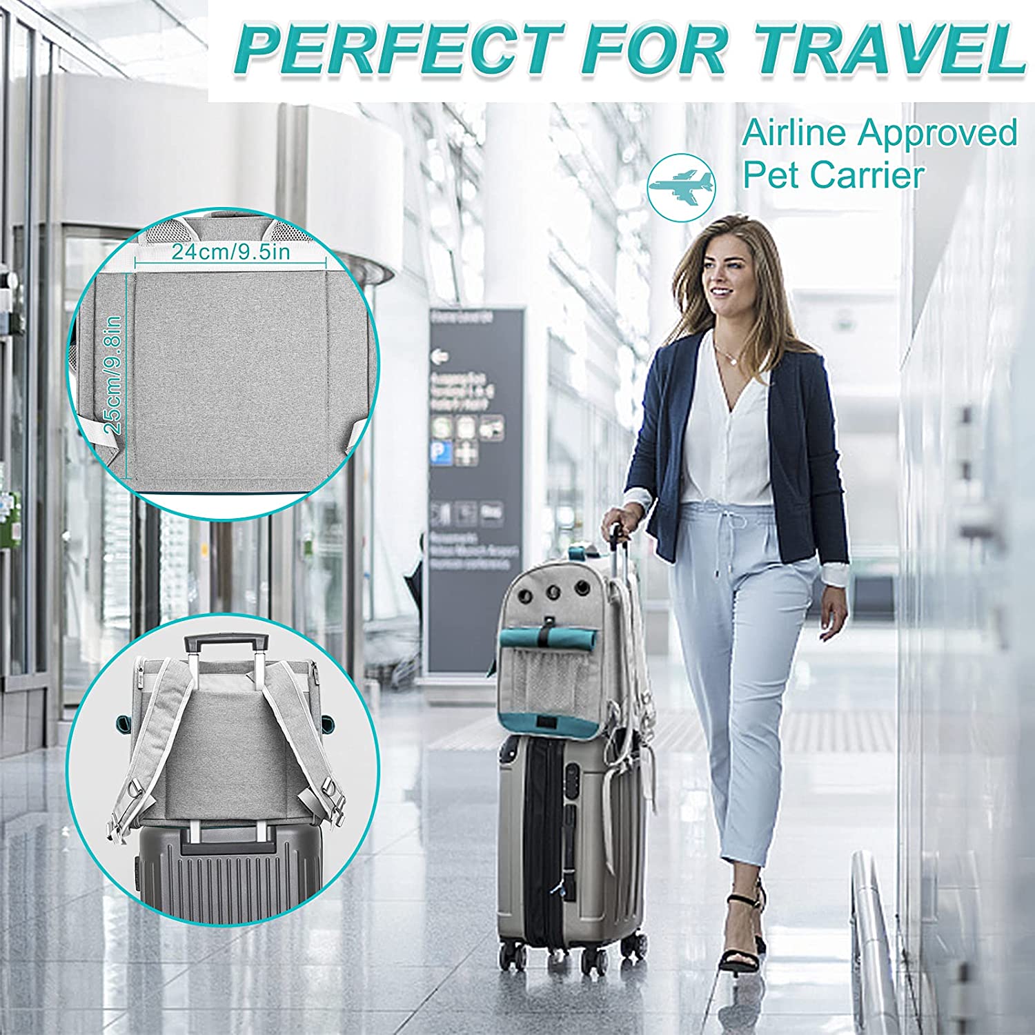 The pet carrier has telescoping handle with wheels, to function as a rolling case. Can be used as a backpack, tote, carrier, or car seat. Comes with removable plush pad for easy washing, tether to secure animal, and wheel cover. Provided your pet fits into the dimensions of the product comfortably when fully assembled, this item will support the weight of your pet. For small pets only - read sizing dimensions of product carefully.