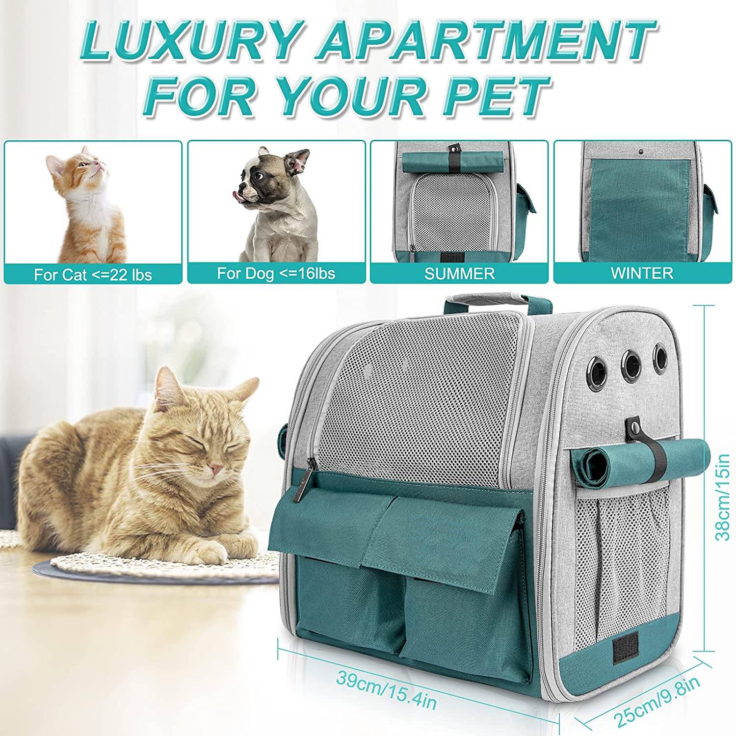 * 【Large space & Airplane Approved】 The cat carrier backpack has been upgraded to provide your beloved pet with the most comfortable "home". The size has been increased to 15.4 "* 9.8" * 15 ", which is easily suitable for large/medium-sized cats and dogs.(Under 22lbs is best) Most airlines approve under the seat. Important note: Please check before traveling Your airline requires it.