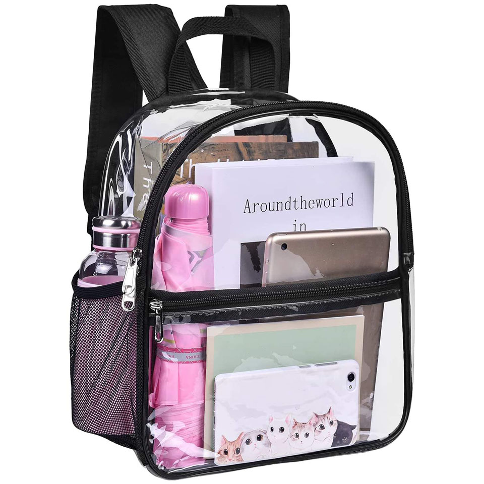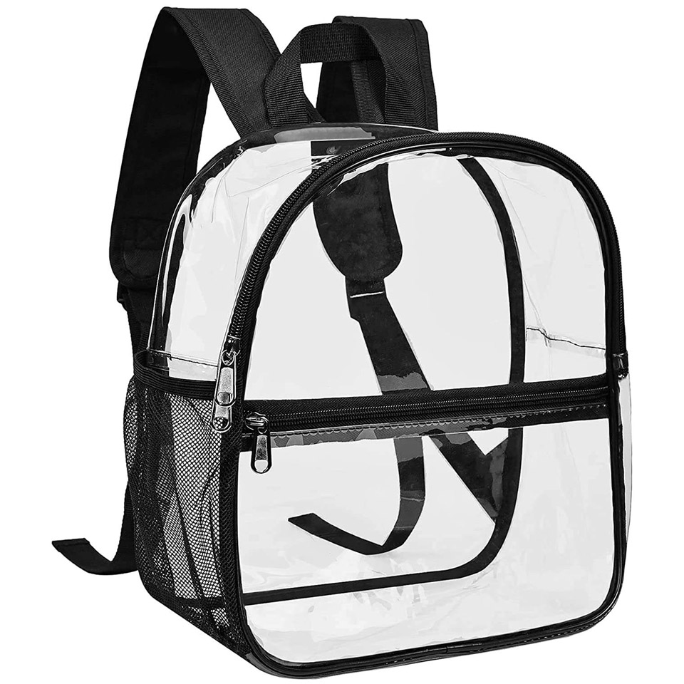 through all around, including back and bottom. Which is perfect for travel, security, stadium sports and much more! * 【 Stadium Approved Size 】- The size of main dual zippered compartment is 12"Hx11"Lx6"W. see through backpack is suitable for sport event, traveling and work. The front pocket is ideal for snacks and includes extra pockets for pencils and other travel necessities. * 【 Stylish and Comfortable Design 】- The reinforced padded adjustable straps add to the soft-comfort for all day wear. The top handle is perfect for when you want to carry your bag and give your shoulders a break. * 【 Reinforced Stitching 】- Stitches around bottom and each corner are reinforced. Anti-tear and Durable for daily use. * 【 Security Checks 】- Completely transparent all around, including back and bottom—great for seeing inside and quickly finding what you need. |