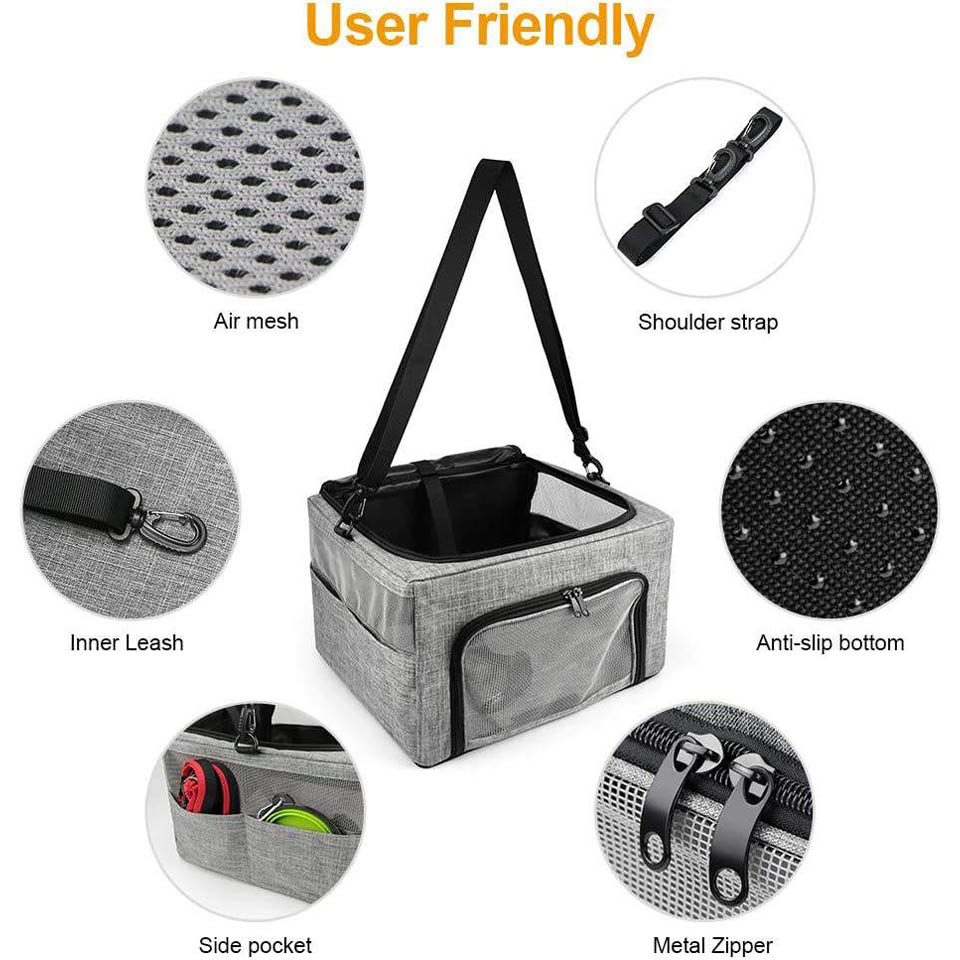 out. 4 smaller pouch is an ideal space to store dog's food, water and any other accessories. The 3-sided mesh fabric on pet dog car seat provide a good air circulation and excellent scene outside the window. * Upgrade Reinforced Beelike Pet Car Carrier - Unlike others,We use upgrade reinforced metal frame ,which made by sturdy stainless steel bars, keep the pet seats in shape any time, not only ensure pet’s safety but also provide a roomy and comfortable shelter for furry babies when riding on car. * Built-in Clip-On Safety Leash Secure & Safe for Pet - The dog car seat booster contains an adjustable size seat belt, which is used to secure the dog’s collar or harness. Avoid the escape of pets. The strap for fixing the car seat can also be used as a shoulder strap.which prevents active dogs from jumping out of the car, ensure dog’s safety. * For the Pets within 15lbs --- This dog travel booster seat with dimensions of approximately 15.7*13.4*9 inches, fit pets up to 15 pounds. With the zipper mesh door and adjustable strap, it can also be wear as a dog or cat bag for a short time moving.When not use, the steel frame is foldable and easy to store the the booster seat, became very compact,won't occupy space. |