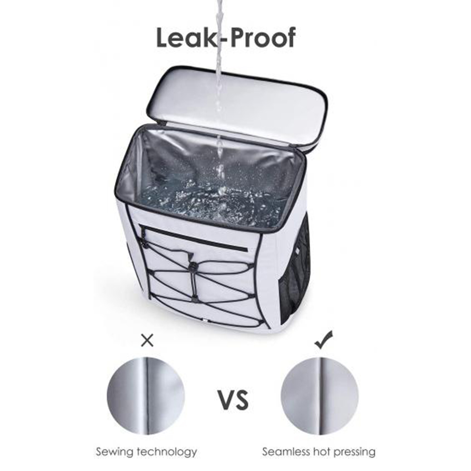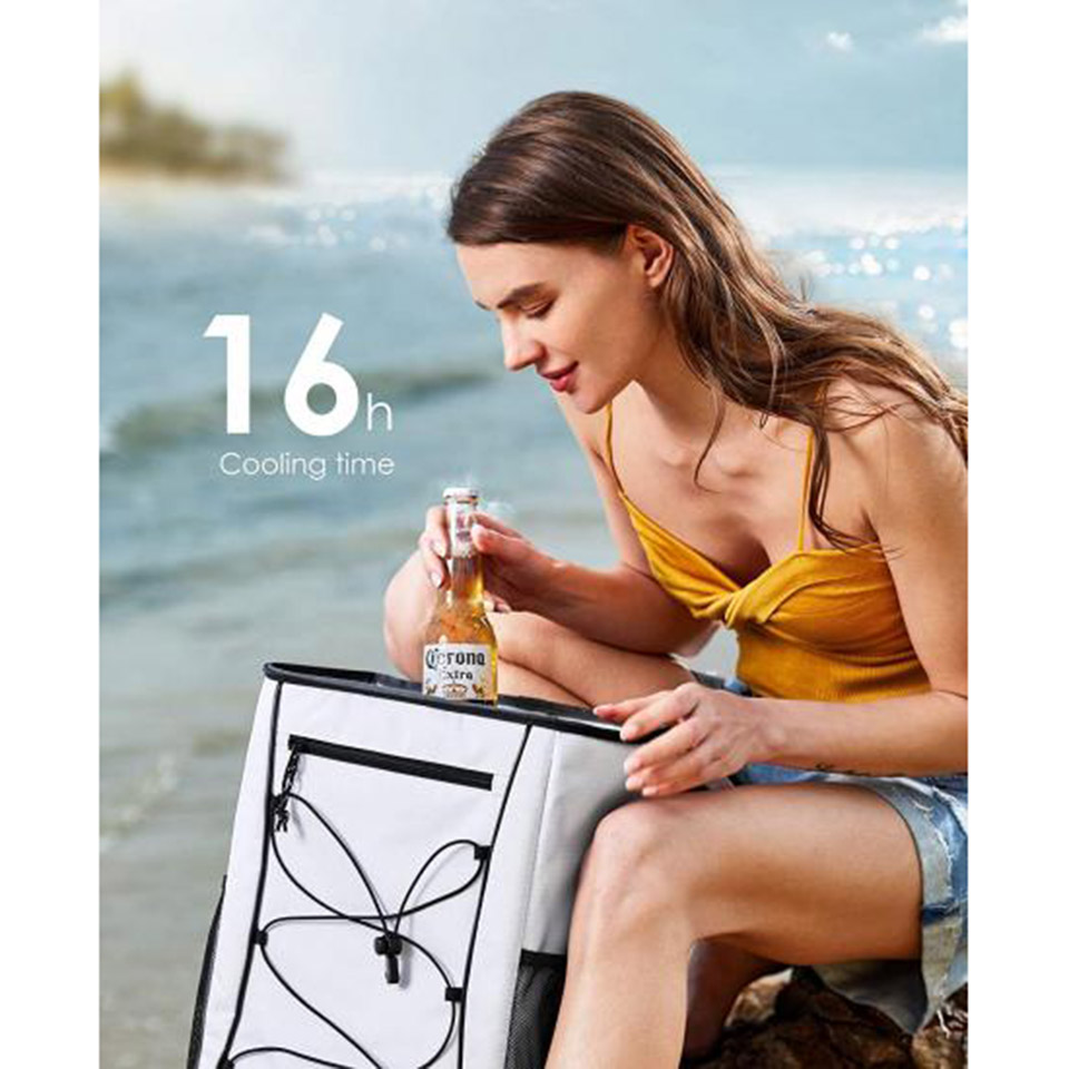 COOLING PERFORMANCE: Guarantee 16 hours at temperature below 15ºC with freeze packs (The duration will vary according to the environment temperature) LEAKPROOF: Thick layer of food-grade PEVA insulation materials inside to ensure the frozen things don't leak after melting LARGE CAPACITY & OPENING: Dimension: 43 x 31 x 17cm; Weight: 620g; About 22L, can hold at least 24 cans. Large opening makes you easy to access COMFORTABLE & PORTABLE: The breathable shoulder straps are very comfy to wear on your shoulders and back. Design with handles, can also be carried by hand. SUGGESTIONS: Don't put the ice directly into the rucksack to avoid cutting off the leak-proof material inside. We can use the freeze packs to keep everything cool all day. Good for beach trips, picnics, camping, hiking, swimming, etc.
