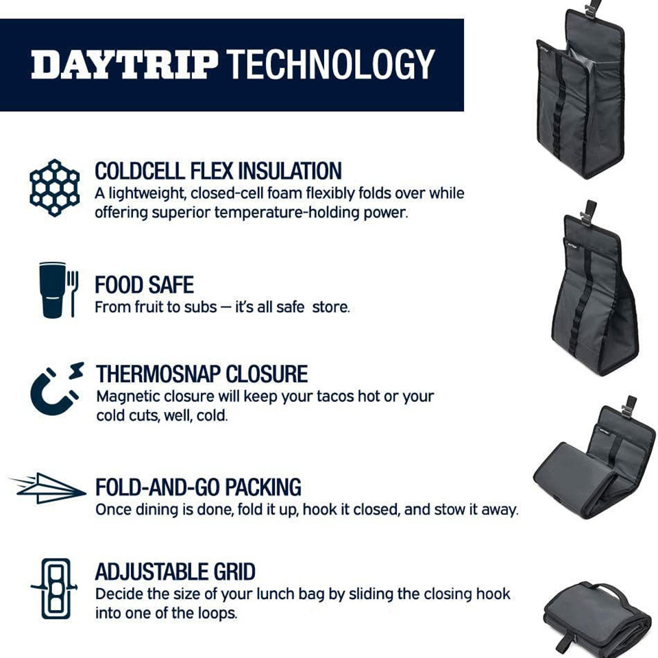* The Daytrip Lunch Bag takes soggy sandwiches and lukewarm drinks off¬ the menu so you can pack a meal you’ll actually look forward to. And yes its Food Safe from fruit to subs - it’s all safe to store.
