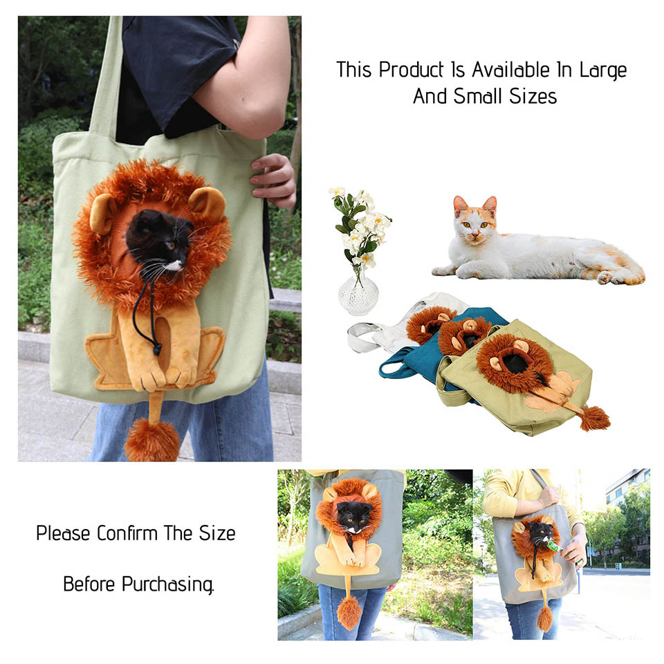SOFT AND BREATHABLE MATERIAL: This cat bag carrier is made of cotton canvas material, which is breathable and soft, which is very suitable for you to carry your cat inside, and the cat will not feel stuffy. APPEARANCE AND SIZE: The appearance of the cat carrying the tote adopts the design of a lion. There are two sizes for you to choose from, namely S: 14.17*13.38*3.9in, and L: 17.3*15.7*3.9in. You should choose S under 5 pounds and L under 9 pounds so that pets can feel comfortable inside. CAT CARRIER WITH WIDE STRAP: The lion-shaped pet canvas shoulder bag's wide and comfortable strap design effectively eliminates the pressure on you, saves effort and peace of mind, and gives your pet a comfortable space. SECURITY: The pet carry bag with a Lock zipper, prevents the pet from running out. The circumference can be adjusted by zipper, and the maximum opening can be adjusted to 7 inches, giving your furry baby a panoramic view while preventing it from accidentally falling off. And there is a hole that looks like a lion to let your pet's head stick out, which can give you a good view of your pet, you can play with them and keep your pet's neck safe. SUITABLE SCENE: If you need to take your pet out for nursing, play, and party, you need such an outcrop cat restraining bag shoulder bag. The outcrop design is also convenient for feeding interaction at any time. Carry your cat, and dog friends to the mall, grocery store, or hospital, and park on your back for daily walks or long-distance walks.