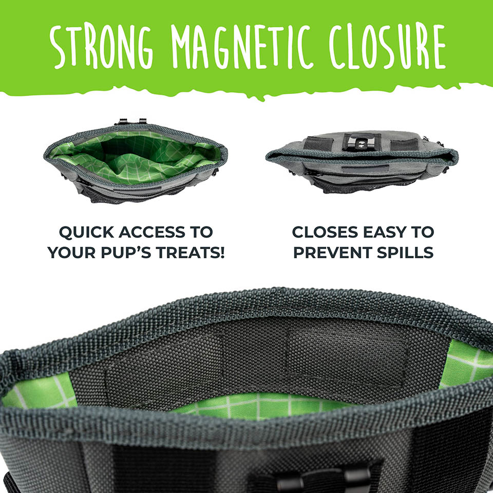 Fits Everything You Need!: This 7" x 2.5" x 5" treat pouch has 4 storage solutions! The main compartment holds two cups of treats or kibbles so you never run out of food rewards. Use the strong mesh pocket and the zippered pouch on the front of the bag to store your phone, wallet, and/or keys. Thanks to our integrated poop bag holder on the side of the bag, you never find yourself in a poopy situation! We’re even hooking you up with a roll of poop bags - on us! Ultimate Versatility: We designed our treat pouch with a multipurpose belt sling and a metal clip. You can wear it 4 different ways: Over the shoulder or across your body using the shoulder strap that adjusts from 30”-52”, around your waist by looping the adjustable belt sling onto the 2 attachment points, or on your belt or pants by attaching the metal clip accordingly. Quick Access Without The Spills: No more fumbling with drawstrings! The Dog Treat Pouch features two strong magnets inside the main treat compartment. This magnetic closure allows you to quickly access your pup’s treats and cinches closed right after to prevent any spilling and curious doggie noses from taking over the bag! Easy to Clean, Stylish & Safe: Our treat bag is made of stylish quality, weatherproof polyester and interior lining which makes it super easy to clean. That means you can use it rain or shine!