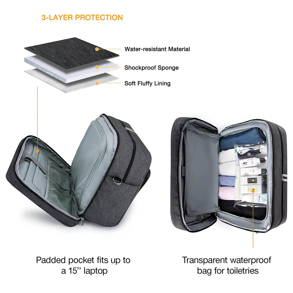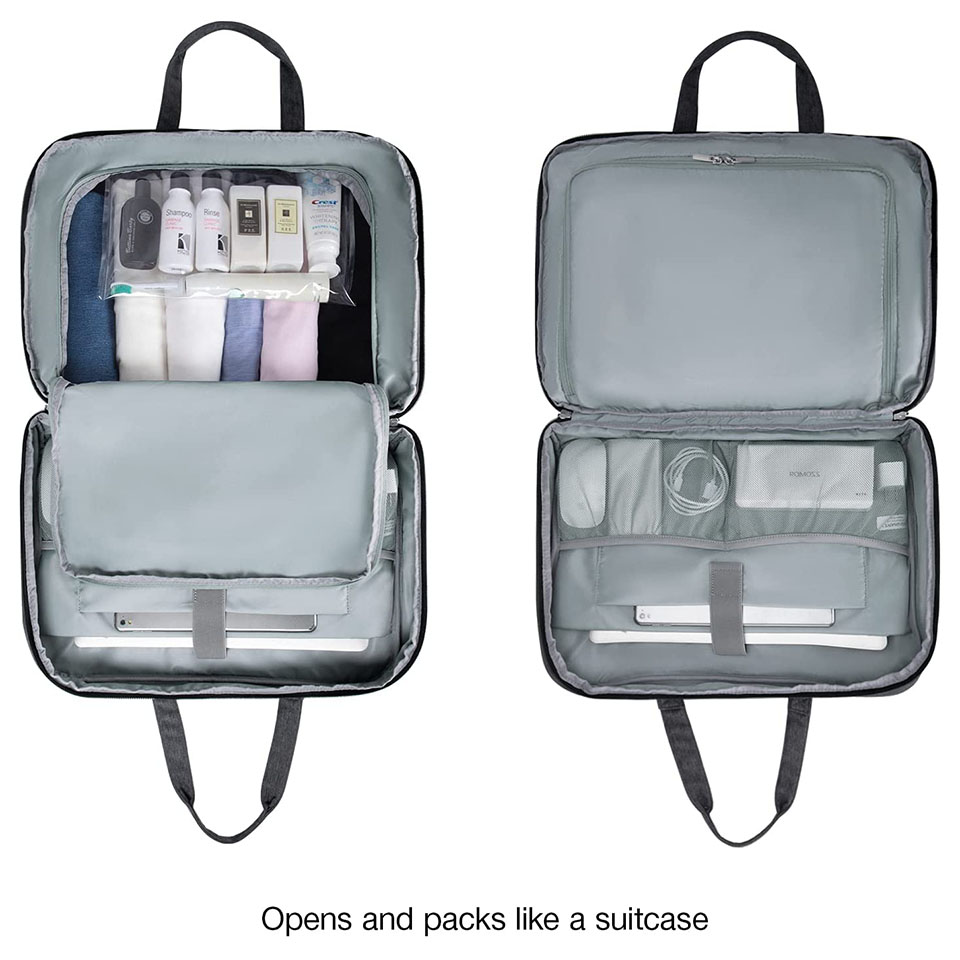 days worth of necessities. * 2 Storage Zones- lifestyle zone: Roomy space with 1 waterproof pocket ,1 shoe bag; Business zone: 1 padded 15.6" laptop compartment, 1 dedicated 10.5" tablet pocket, a file section and multiple accessory compartments. * Travel-friendly Design- opens down the middle like a suitcase for easy packing and TSA checkpoint. * Versatile Feature- padded shoulder strap + back luggage handle strap + water resistant polyester fabric. * It makes a great choice to be used in various ways and places, suitable for travel, business trips, gym, commuting, outdoor activities, universities, offices, excursions. |