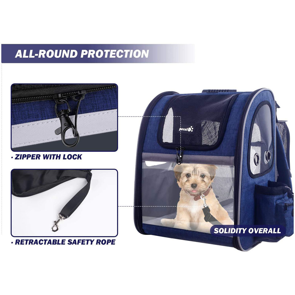 • Whether you need a cat backpack carrier or a dog backpack carrier, this pet carrier backpack will keep your fur friend safely inside, allowing you to focus on managing your trip. • The leash tether could be attached to your pet to prevent escape if you want to leave the top open for your pet to stick their head out. • The high grade scratch-resistant polyester and reinforced metal zippers serve as another barrier to prevent escape, so give your pet ultimate protection.