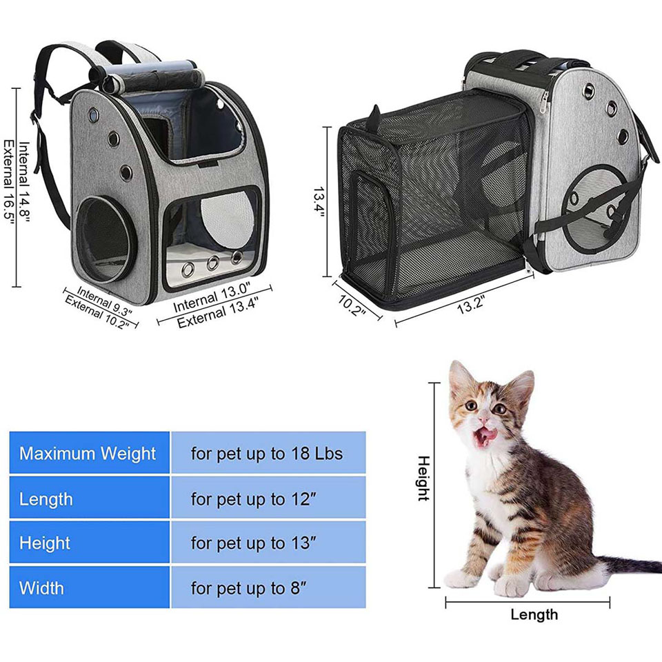 air circulation, but also allows your pet to stay in it more comfortably and move around more freely * BETTER VENTILATION&VISIBILITY: The most important improvement of this backpack is to ensure excellent ventilation and visibility at the same time. 1 large transparent acrylic window, 3 breathable mesh windows and 9 venting holes, provide plenty of air and excellent view for your pet * STURDY&SAFE STRUCTURE: Equipped with a firmly reinforced structure, to prevent the backpack from collapsing on your pet while traveling. When you open the top mesh windows to let your pet stick his head out, the safety rope inside can prevent your dog from running away * COMFORTABLE TO WEAR: Comes with both waist and chest buckles, to give you extra support and maintain the stability of the backpack, prevents pets from slipping. The shoulder straps are equipped with extra thick padding for more comfort during long trips * MEASURE YOUR PET BEFORE PURCHASEING: Its external size is 13.4"L x 10.2"W x 16.5"H while the internal size is 13.0"L x 9.3"W x 14.8"H and can be 13.0"L x 21.5"Wx 14.8"H after fully expanded. Recommended max load is 18 lbs. Do not select the backpack size based on weight only, please reference your pet's length(front feet to base of tail) and height(floor to top of head) in selecting a backpack size |