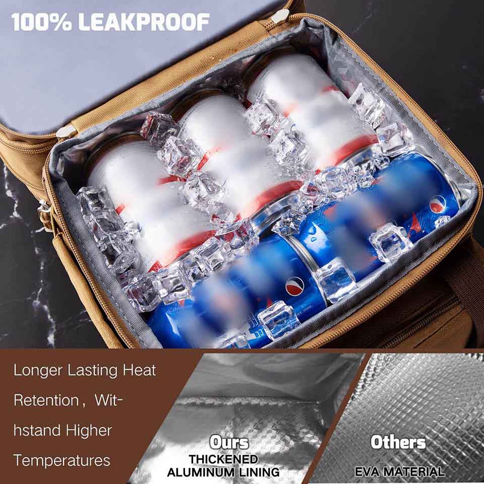 * Extra durable military material! The lunch box outer layer is made of 900D PVC heavy-duty waterproof Oxford cloth, the middle is made of high-quality EPE foam, and thickened aluminum lining with the hot pressing process, which is leak-proof and easy to clean to ensure good heat insulation in any weather and keep food cold, warm and fresh for a long time. You can put the ice packs in the insulation cooler bag to keep the best cold effect. * Very cool-looking and functional design! Classic military style/tactical cooler, includes rear MOLLE webbing for extra storage/attachments, The top of the front pocket is for tapping patches, sturdy zipper with ropes and sealed zipper on the main compartment, reinforced handle, and removable adjustable soft padded shoulder strap, easy to carry, it's also the perfect gift for a man, dad, husband, son or boyfriend! |