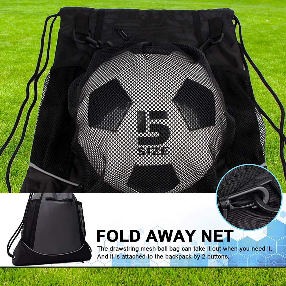 burden , that is why this drawstring bag is very comfortable to use * Widely Apply : Suitball for gym, yoga, hiking, camping and other outdoor activities. The soccer backpack can hold some portale electronics and all kinds of small sports equipment. The mesh bag can carry many kinds of ball like basketball, football, volleyball, etc. * Fold Away Net : The drawstring mesh ball bag can take it out when you need it, or put it back in the zippered pouch when you do not use it. Fit a full size soccer, basketball, baseball helmet or whatever else you or your kids need to play. The mesh bag is attached to the backpack by 2 buttons * Large Easy Open Drawstring Bag : The main bag is large enough to hold anything from lunch to your sneakers, cleats or other gear * Front Zippered Compartments : In addition to the main pockets and a drawstring mesh ball bag, it is also designed 2 zip pockets and 2 side mesh pockets. The zippered compartments are convenient to keep the safety of your personal belongings, clean and organized. Such as home key, wallet, cellphone or small valuables. 2 side mesh pockets for water bottles, baskball bats, umbrellas or whatever else you want to keep them |
