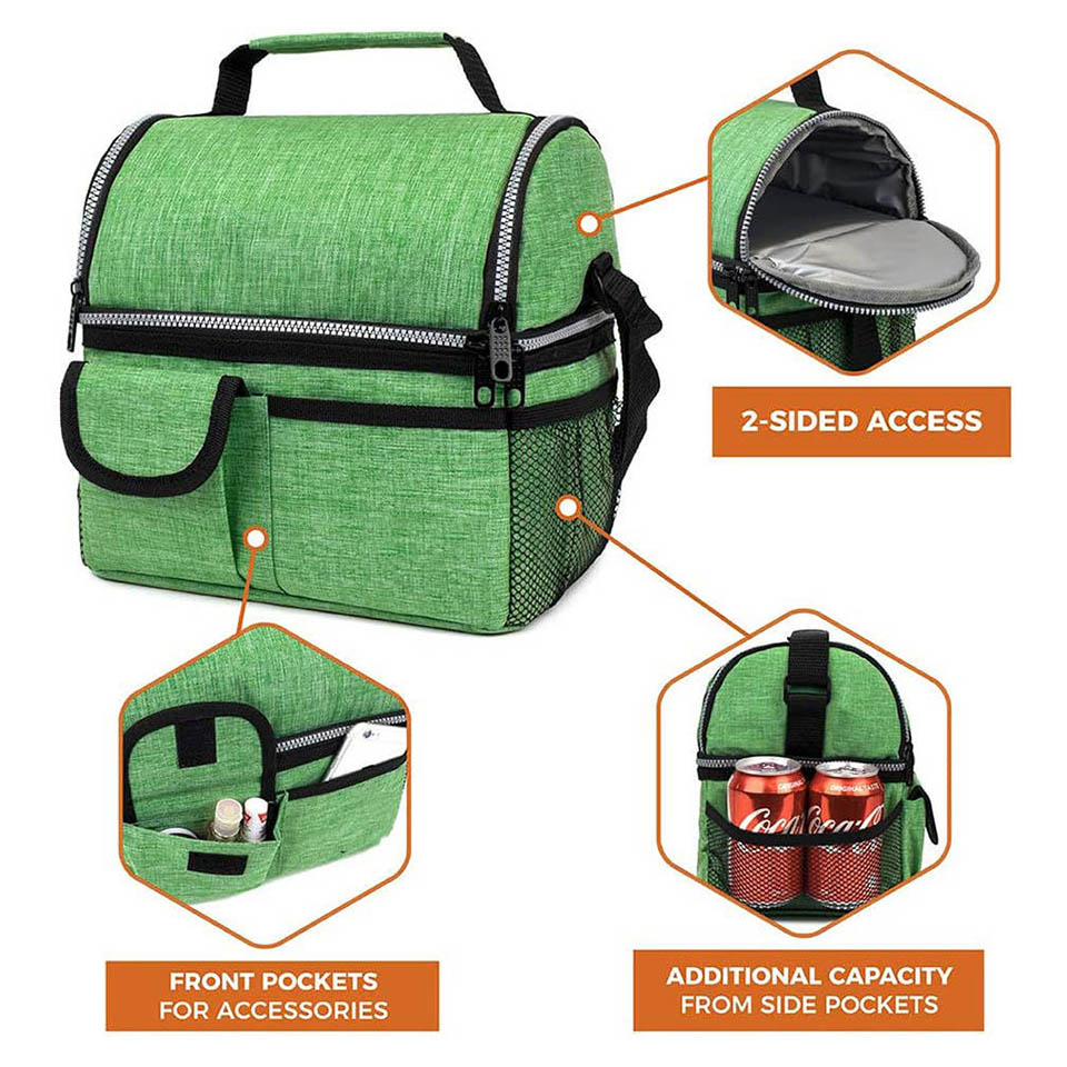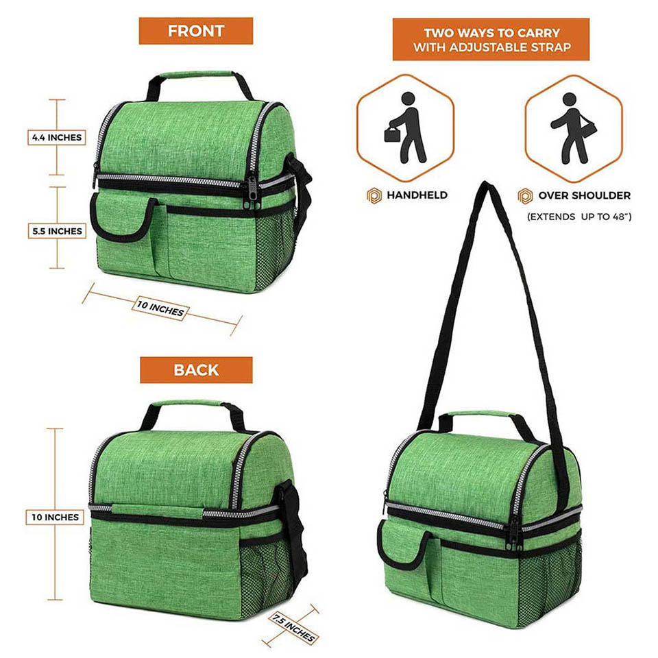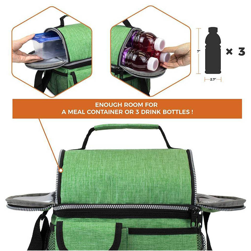 And if that's not enough, the top compartment has enough space to carry another container of food or 3 standard size water bottles! * SEPARATE HOT AND COLD FOOD This lunch bag offers different ways of packing your food. Its 2 isolated compartments allow you to separate hot and cold food/beverages, and two-sided zipper design makes for easy and convenient access. With this extra space,it is also great for ice packs and ice blocks to keep your food extra fresh. * DURABLE AND RIP RESISTANT Made with high-quality nylon and 600D polyester fabric with reinforced zippers to prevent rips and ensure maximum durability. * MULTI-USE & CONVENIENT: Great for men and women to pack food and drinks for work, school, picnics, beach, road trips, camping, traveling or any outdoor activities. Comes with an adjustable shoulder strap and top handle to easily carry around, and two side mesh pockets for water bottle storage. Our reusable lunch pail is perfect to preserve freshness for those on the go. |