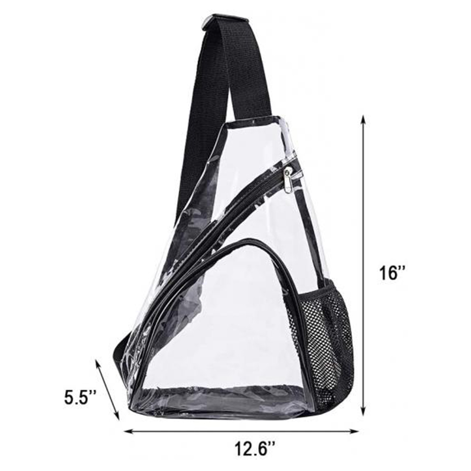 * Compact Yet Spacious Clear Sling Bag: 16” x 12” x 5.5" clear backpack is compact enough to use as a purse but big enough to carry your most important things in large zip compartments, one phone pockets and external water bottle holder.