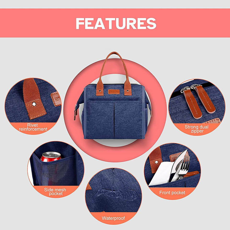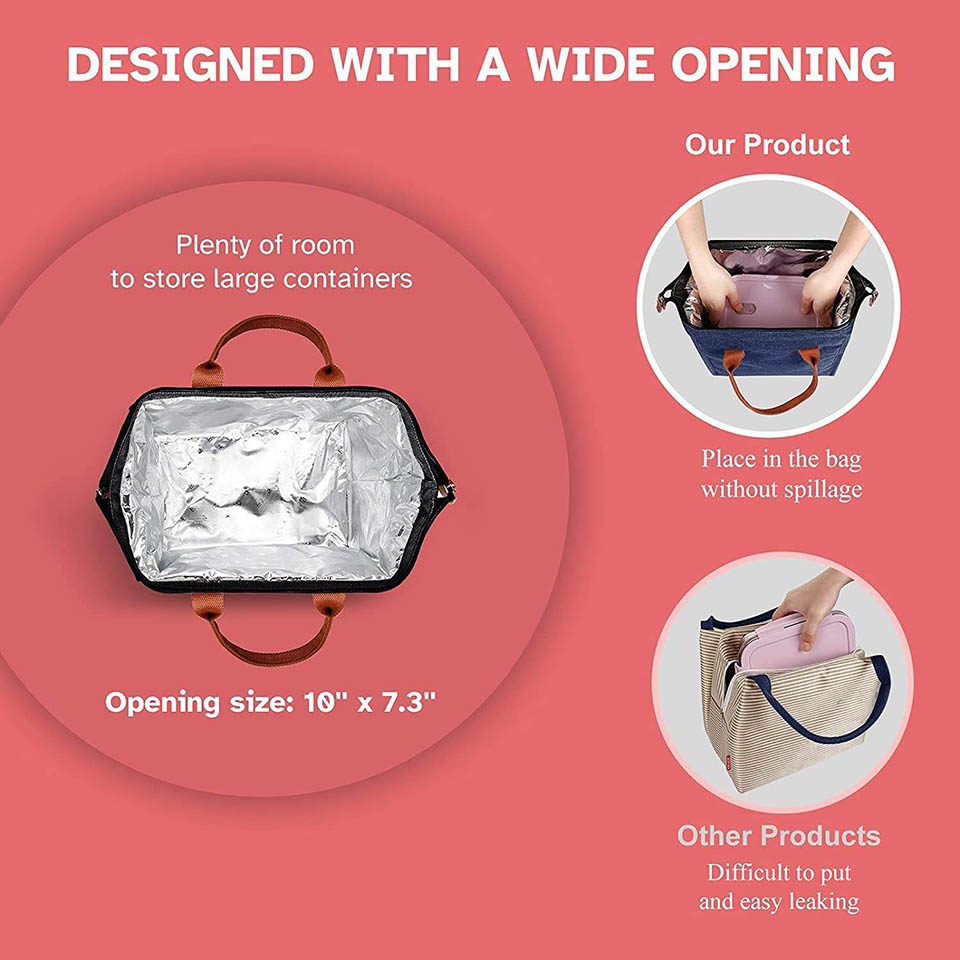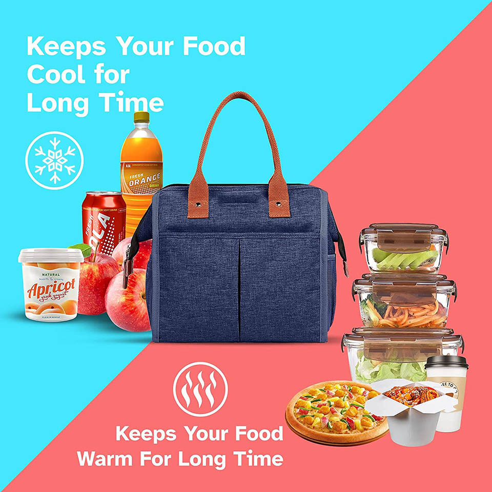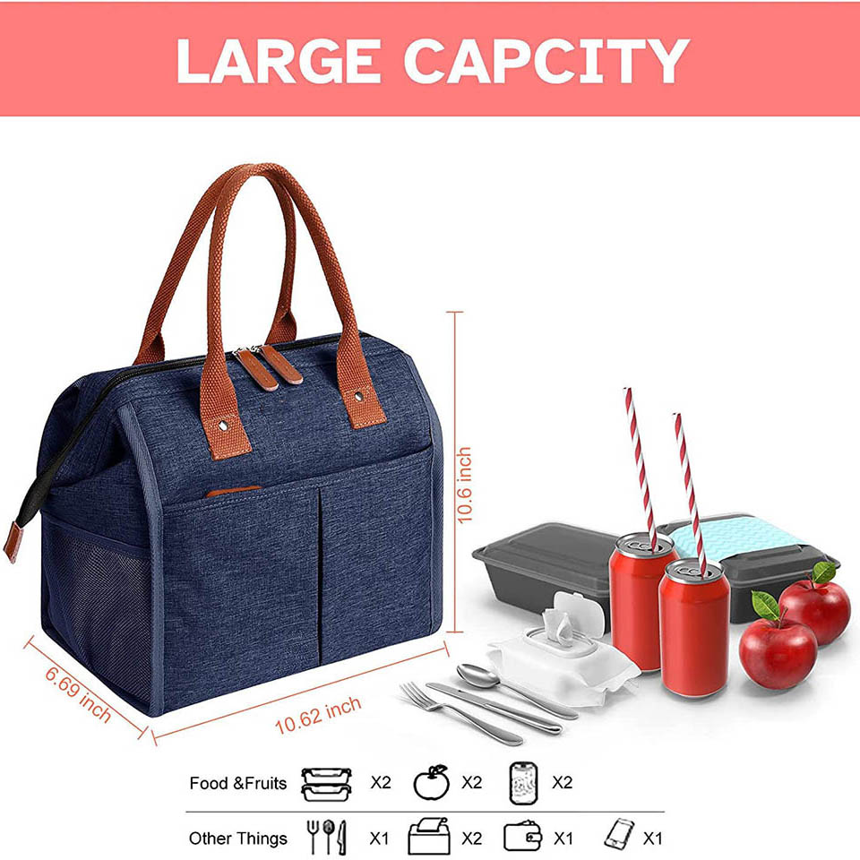 * \uD83D\uDC5CHUMANIZED STRUCTURE: Insulated lunch bag adopts opening design and dual zipper, there are metal wires on both sides of the opening to fix the opening, allowing you to easily put in/take out the lunch box, drink and food. The fashionable style design makes the lunch bag is ideal to be used for men and women. * \uD83D\uDC5CLARGE CAPACITY: Size: 10.5LX6.5WX10H. This lunch box has a large internal capacity which can hold up to 12 Cans. The front pocket can be put into tableware, snack, wallets or mobile phones and daily supplies. The mesh pockets on both sides can be put into water bottles and umbrellas. * \uD83D\uDCA7GREAT MATERIAL: The lunch bag has been upgraded, thick aluminium foil lining is seamless to enhance leakage prevention,easy to clean inside compartment; The thick insulating foam in the middle layer of the cooler bag can keep food cool, warm and fresh for a long time; The exterior uses Oxford cloth material, which is waterproof and wear-resistant. * \uD83D\uDC64MULTIFUNCTIONAL USE: Heavy duty lunch box of the handle is made of linen material and combined with high-tech sewing technology so that lunch tote strong and durable which can hold lunch boxes, fruits and drinks at the same time, allowing you to taste warm food and cold drinks in office areas, schools, picnics, travel and camping. * \uD83D\uDD14WARRANTY SERVICE: We provide you with three-month warranty service. In the process of using the lunch bag, please feel free to contact us if you have any questions, we will do our best to solve it for you. |