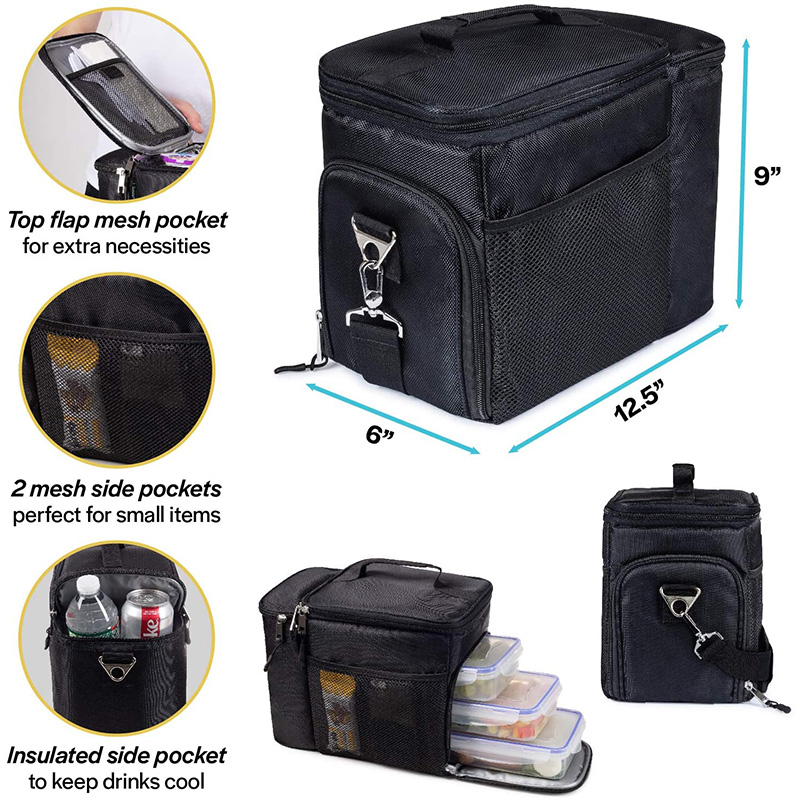 Product name:Cooler Lunch Bag Usage:Food Storage Color:Black Size:12'' (L) x 7'' (W) x 9'' (H)