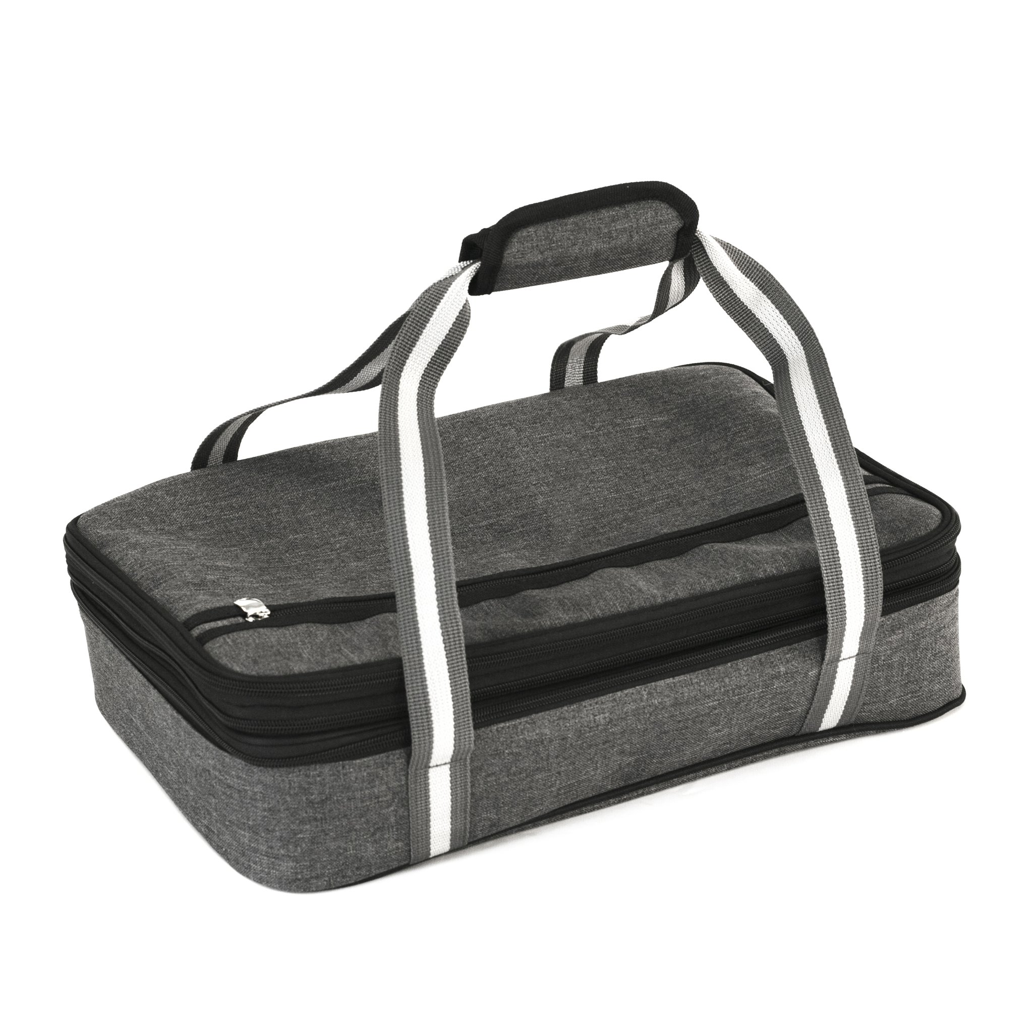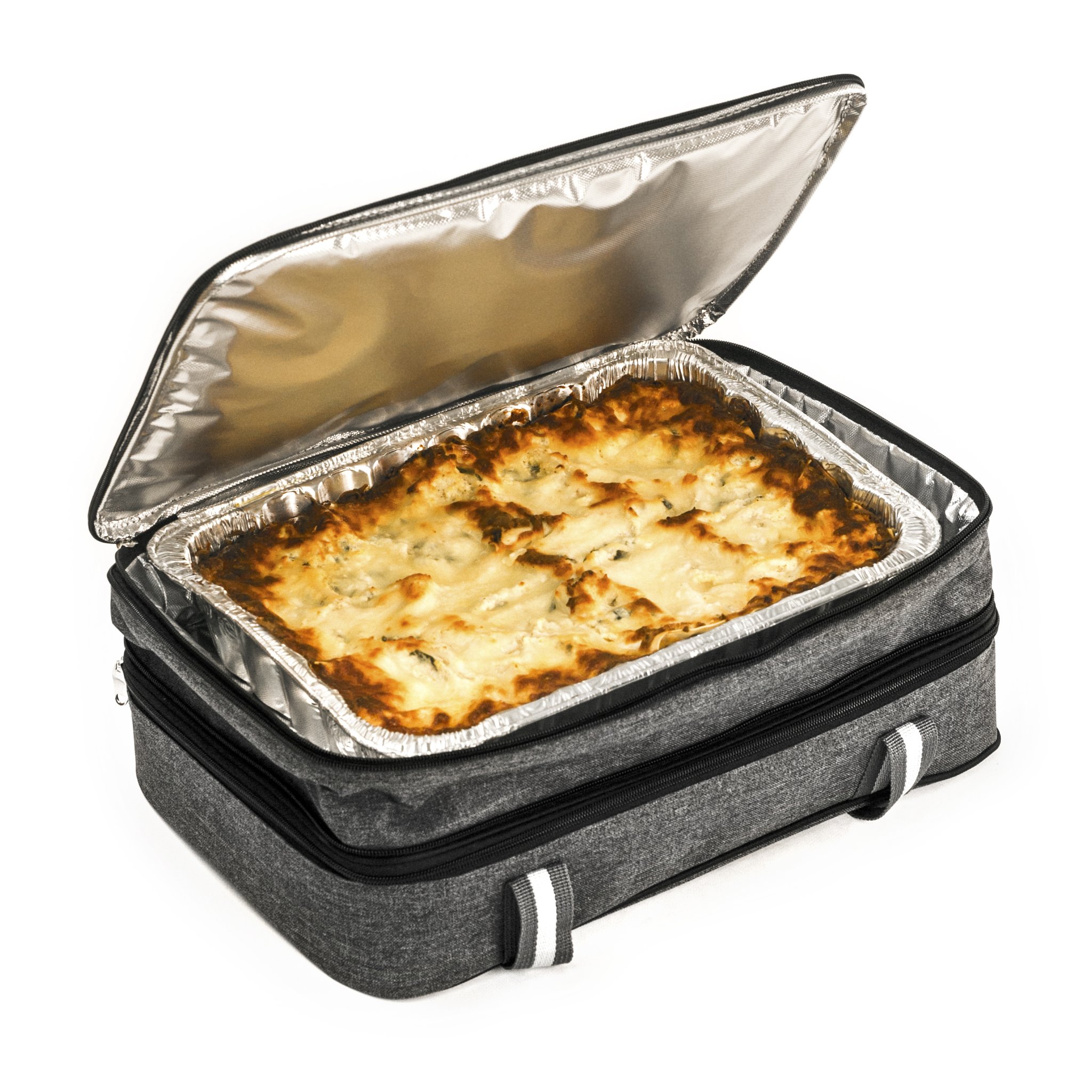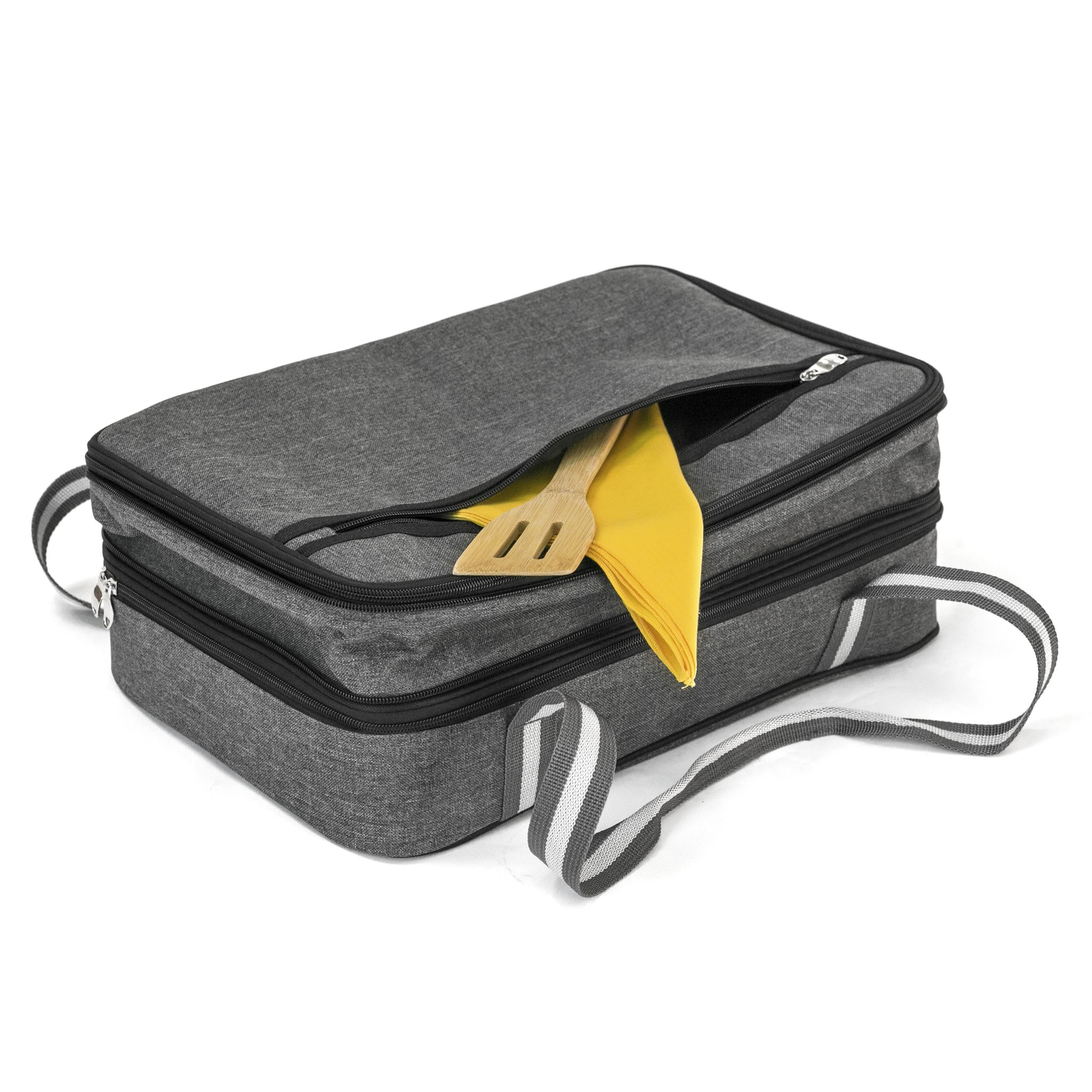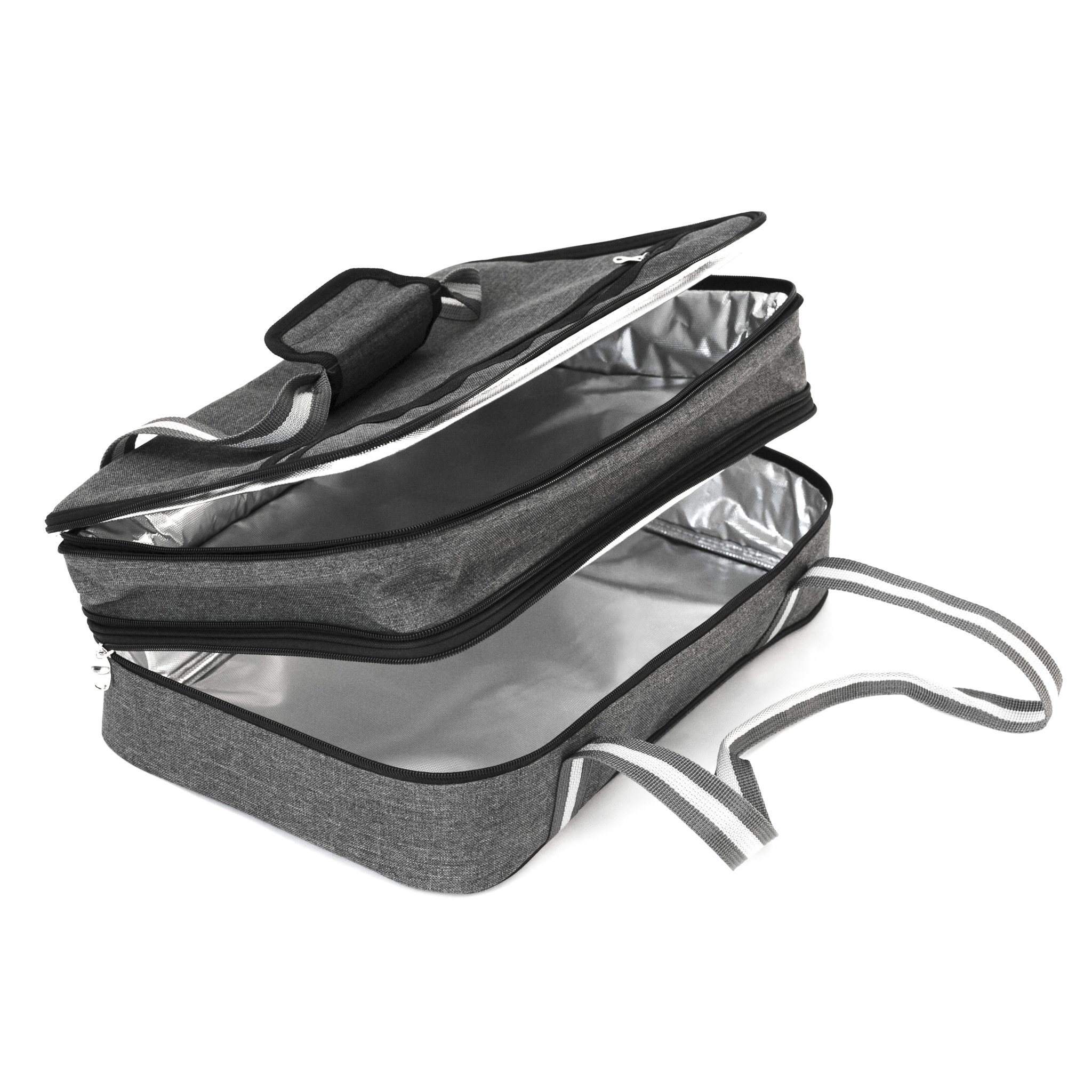 EXPANDABLE OVERSIZED BAG: This insulated bag has a large main compartment on the bottom and an expandable top compartment. Each inside compartment is 16" x 11" x 3" and can hold a 11” x 15” baking dish (5 QT Pyrex standard glass bakeware). Dish is not included.