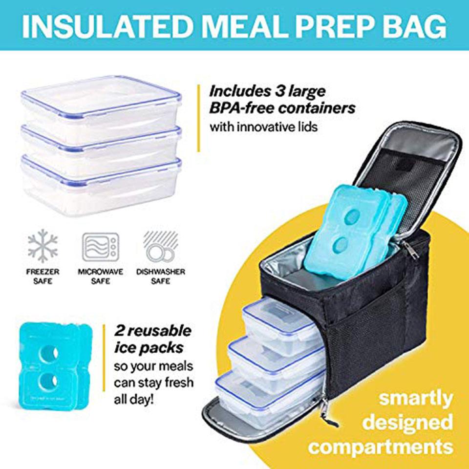 lunch bag, 16.5" L x 7" W x 10.6" H overall; 9" x 7" x 9.8" inside 3 leakproof food containers – BPA-free & FDA-approved – each holding 45 oz. (1350ml) 2 large, reusable ice packs, each 6.3" x 8.6" x .8" Bonus 22-oz. food-grade shaker (3.4" wide, 9.6" high) with built-in storage for vitamins & protein powder