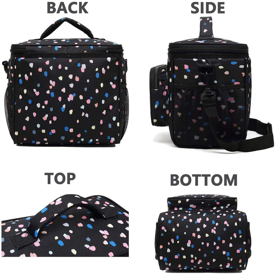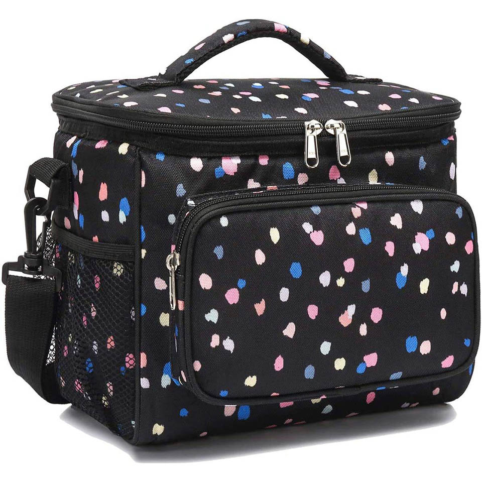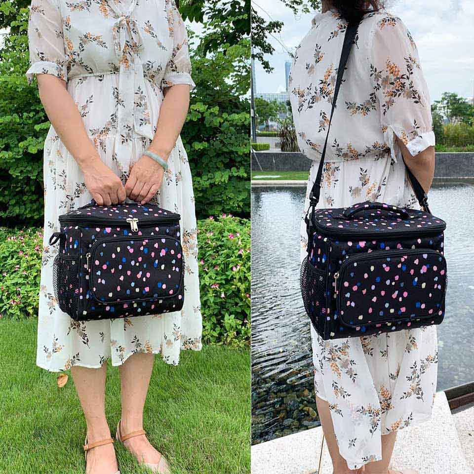 lining,PE foam insulation and strong sturdy SBS zippers. This material is high quality and rip resistant.Our great cooler tote could keep your food in the storage cold for more than 9 hours when you put 2 ice packs into the bag. It is water resistant and heavy duty. * ✿ Large Size:the dimension of the container is:10.24”L×7.48”W×9.06”H,but not too bulky , it could give roomy storage space you need to hold your favotite meals,delies and lunch treats.You could fill the roomy compartments or pockets with lunch boxes, food containers, condiments,fruit salad bowls,utensils,napkins,can opener,wallet,keys and other essentials. Keep your water bottles or energy drinks inside the mesh pocket and quench your thirst of the spot. * ✿ Function:This soft Insulated Lunch pail could keep your stuff cold or warm for hours as interior lining with food grade PEVA material, you can prepare full meals and enjoy healthy food anywhere you go - On hiking,travel,camping, at the gym, for lunch to work, to picnics, shcool,adventures to the beach and fishing.It is easy to clean. * ✿ Comfortable Wear:The great thermal lunch kit is crafted, easy to carry with comfort-grip handle and removable and detachable shoulder strap.You can carry the bag by the handles when you use the top handle, and also it could be used as a crossbody bag or a shoulder bag when you use the 48" strap.Its durable and easy to pull zippers will never trouble you. * ✿ Compact Bag:This unisex foldable tote is lightweight, compact and portable, it could easily carry your favorite lunch or meal prep containers to school,at work, office, while traveling, camping with your family, fishing with your pals, while boating, and hiking, enjoying a romantic picnic in the park, when driving your kids to school, open air music festivals, sports, and BBQ Sundays!It is suitable for women,men,male, female,big kids,girls,boys,ladies. |
