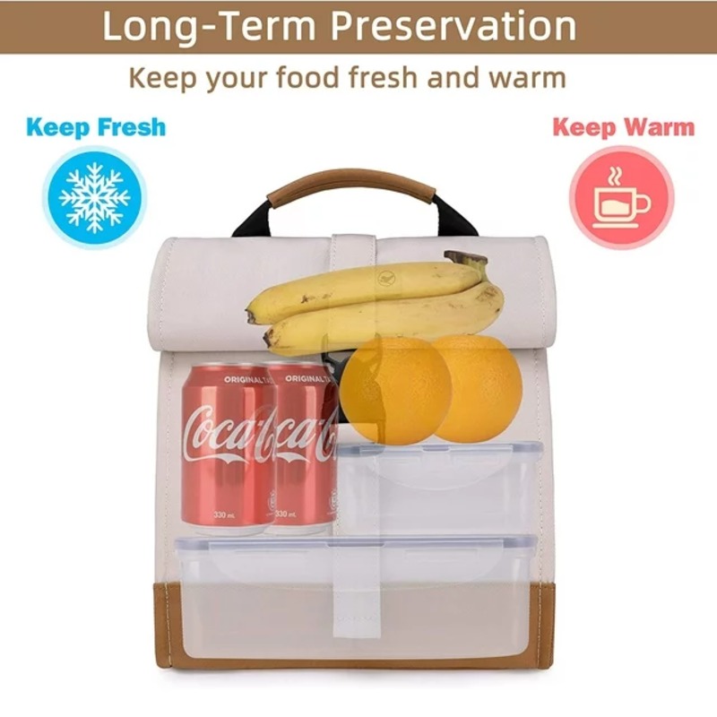 The top of the bag is made of PEVA material, for keeping your food fresh, suitable for fruits, snacks,drinks, etc The bottom of the bag is made of aluminum foil, for keeping your food warm, different temperatures can maintain 4-8 hours of insulation Size of lunch bag: 24 x 20 x14.5cm, the top of bag:20 x 14 x13cm, the bottom of bag:20 x 15 x 9cm , The length of shoulder strap is adjustable(MIN:29cm, MAX:55cm) The bag is convenient to carry to school, work, picnic, camping,fishing trip etc. Several pockets on front and back for something needed,like phone,tableware, transportation card,earphone,etc Made of high quality and strong oxford cloth, the bag is suitable for hand wash in cold water, NOTE:don't wash in hot water or machine wash