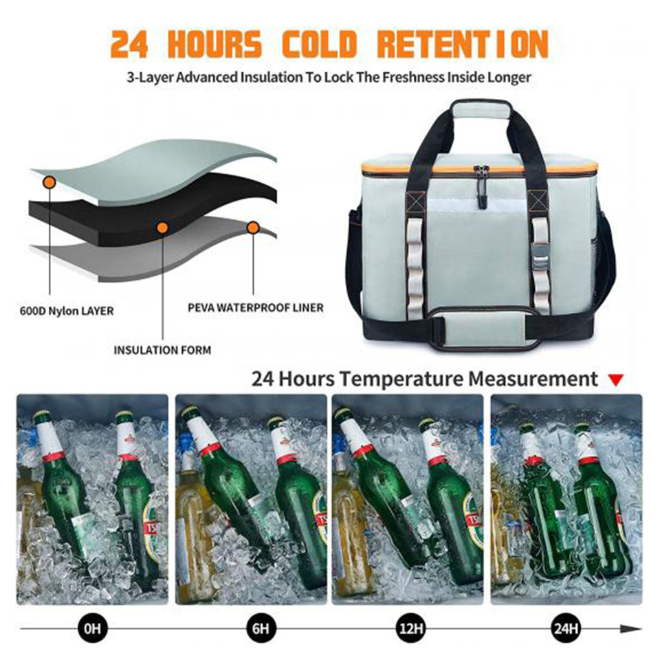 COOLING PERFORMANCE: Guarantee 16 hours at temperature below 15ºC with freeze packs (The duration will vary according to the environment temperature) LEAKPROOF: Thick layer of food-grade PEVA insulation materials inside to ensure the frozen things don't leak after melting LARGE CAPACITY & OPENING: Dimension: 43 x 31 x 17cm; Weight: 620g; About 22L, can hold at least 24 cans. Large opening makes you easy to access COMFORTABLE & PORTABLE: The breathable shoulder straps are very comfy to wear on your shoulders and back. Design with handles, can also be carried by hand. SUGGESTIONS: Don't put the ice directly into the rucksack to avoid cutting off the leak-proof material inside. We can use the freeze packs to keep everything cool all day. Good for beach trips, picnics, camping, hiking, swimming, etc.