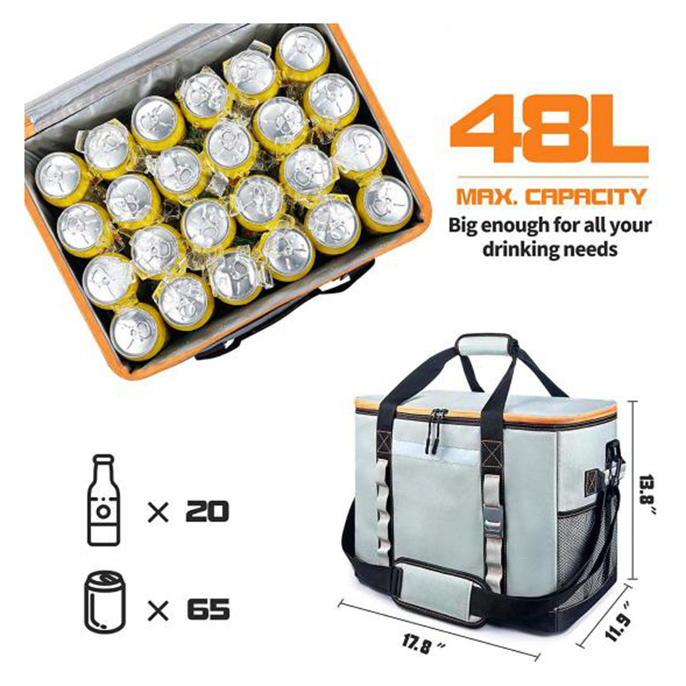 Material: Polyester Type: Shoulder Bag Use: Food Description: cooler bag Color: customized Dimension: 46*25.5*30.5CM Lining: PEVA Certificates: BSCI,Sedex,TUV,ISO9001 Sample time: 7 days Sample charges: USD50 Warranty: 1 year against defect of materials and manufacturing OEM/ODM: Accepable Features: Large cooler bag Perfect for road trips a day at the beach or party