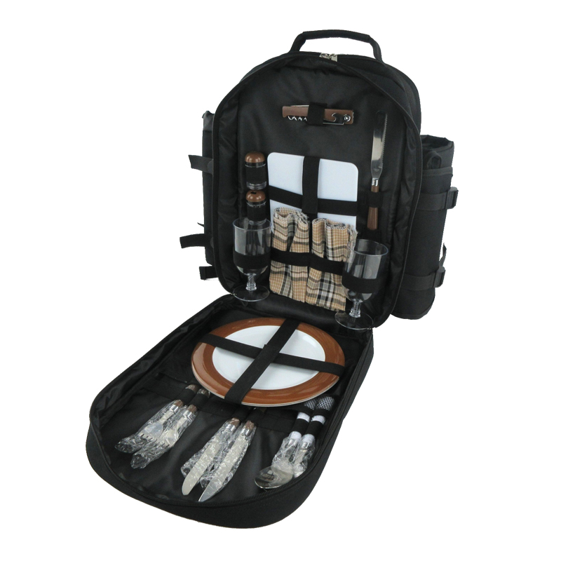 MATERIAL: Acceptance of a dense 600D Oxford cloth, strong and wearable. Made of PEVA material, the PEVA food compartment inside, through the LFGB food safety test, insulation preservation. TABLEWARE PACKAGING FOR TWO: Ideal to cater for 2 people and includes all the essential flatware items needed for a small picnic - 2x stainless steel knives, forks, spoons, dinner plates, cotton napkins, plastic wine glasses,salt and pepper shaker and 1x bottle opener, cheese/butter knife,plastic chopping board.PERFECT FOR TRAVEL: There are two compartments accessed via zip on both sides of the bag. Well-made adjustable shoulder strap for transporting your favourite drinks in elegance.LARGE SPACE: .Large enough to accommodate picnic essentials for the entire family, and small enough not to cause trouble, ideal for camping, hiking, barbecue, etc.