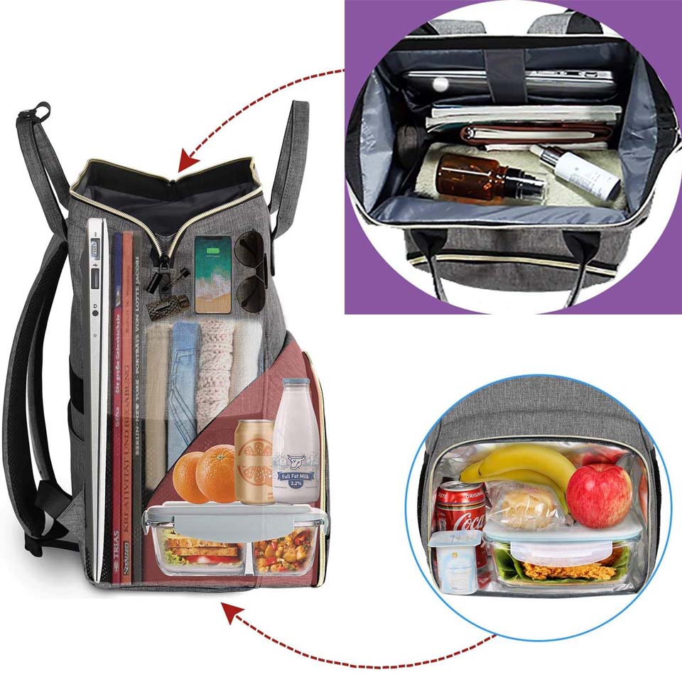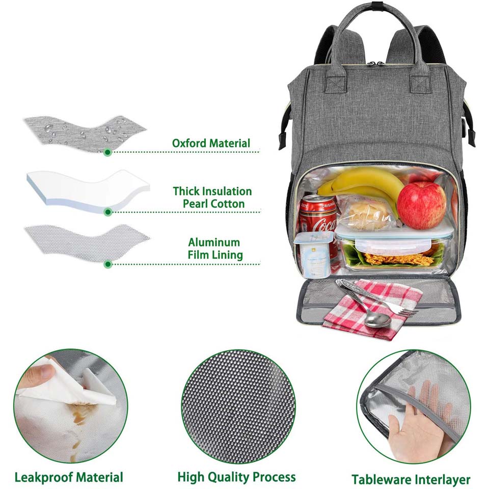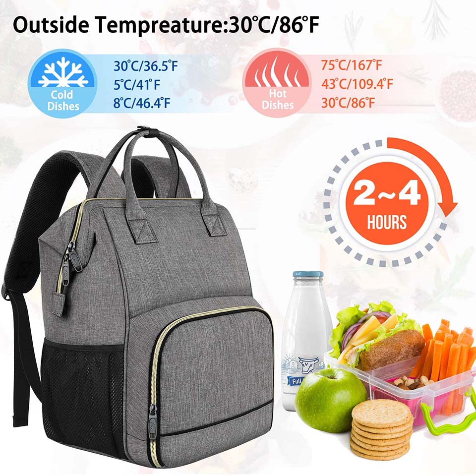 The top of the bag is made of PEVA material, for keeping your food fresh, suitable for fruits, snacks,drinks, etc The bottom of the bag is made of aluminum foil, for keeping your food warm, different temperatures can maintain 4-8 hours of insulation Size of lunch bag: 24 x 20 x14.5cm, the top of bag:20 x 14 x13cm, the bottom of bag:20 x 15 x 9cm , The length of shoulder strap is adjustable(MIN:29cm, MAX:55cm) The bag is convenient to carry to school, work, picnic, camping,fishing trip etc. Several pockets on front and back for something needed,like phone,tableware, transportation card,earphone,etc Made of high quality and strong oxford cloth, the bag is suitable for hand wash in cold water, NOTE:don't wash in hot water or machine wash