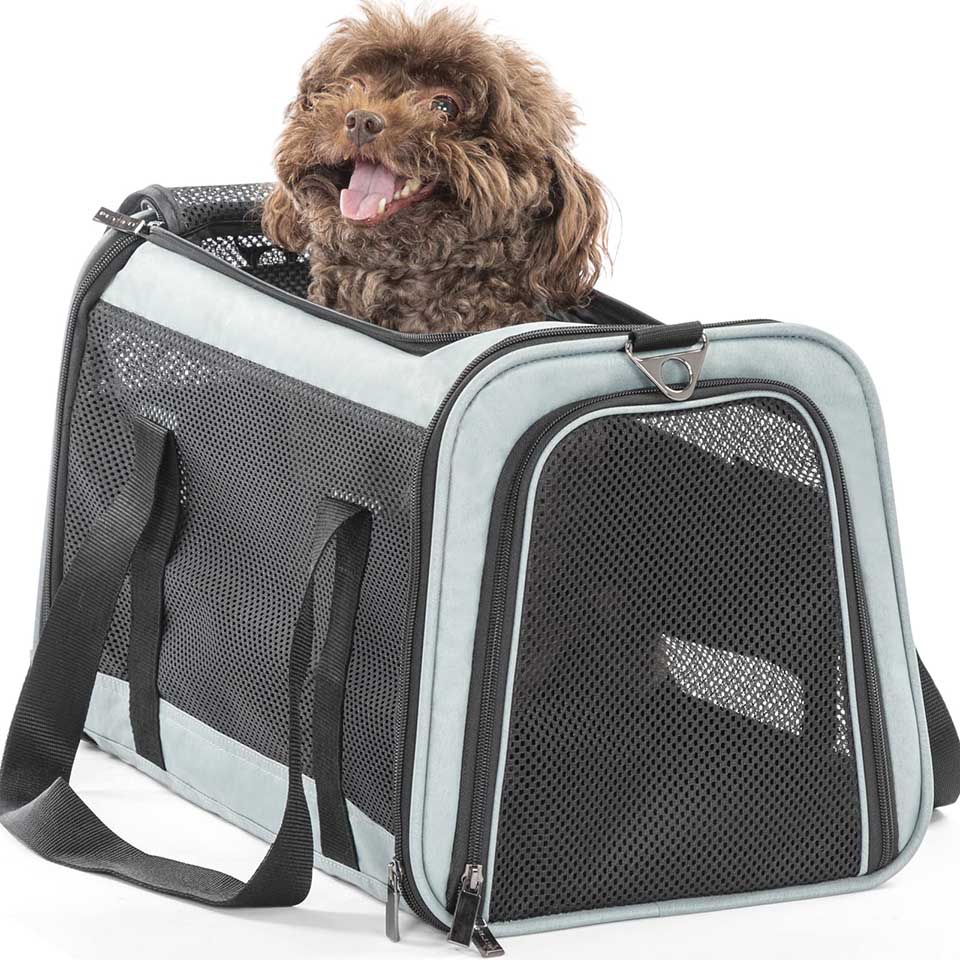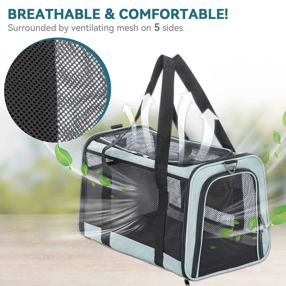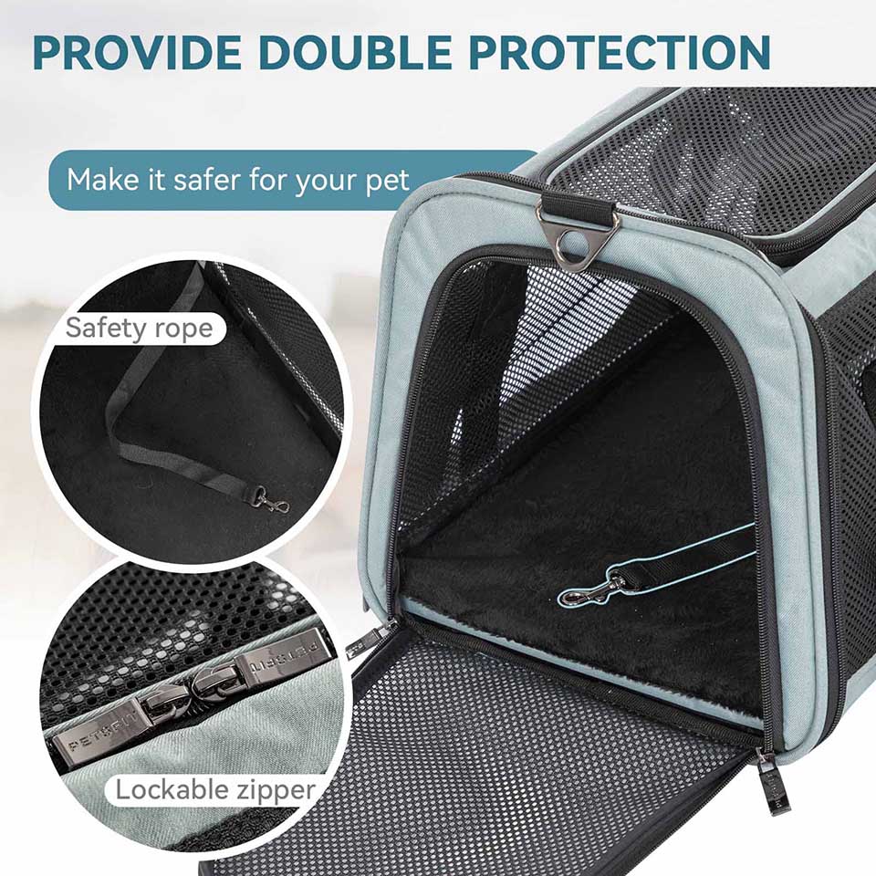 This pet carrier provides two connecting loop handles for balanced carrying as a dual seat belt or luggage strap to secure transport.And it is easy to carry and store, which has a padded shoulder strap and handles.
