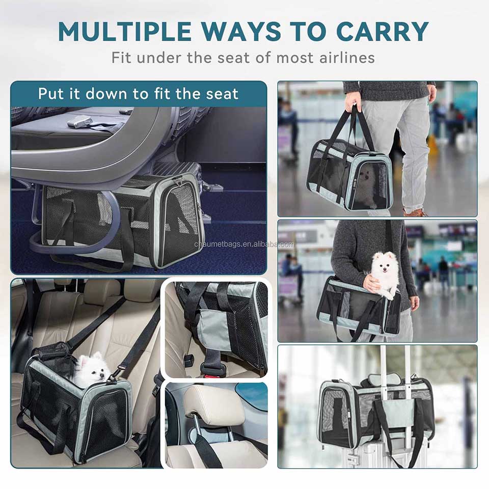 Essential details Place of Origin: Fujian, China Brand Name: chaumetbag Application: Small Animals Item Type: Backpacks Closure Type: zipper Material: Oxford Pattern: Solid Description: Airline Approved Soft-Sided Pet Travel Carrier Size: 43.2L x 25.9W x 28.5H cm Color: Customized Material Type: Oxford Certificates: BSCI,Sedex,TUV,ISO9001 Sample time: 5-7 Days Sample charges: USD50 Warranty: 1 year against defect of materials and manufacturing OEM/ODM: Accepable Function: for travel