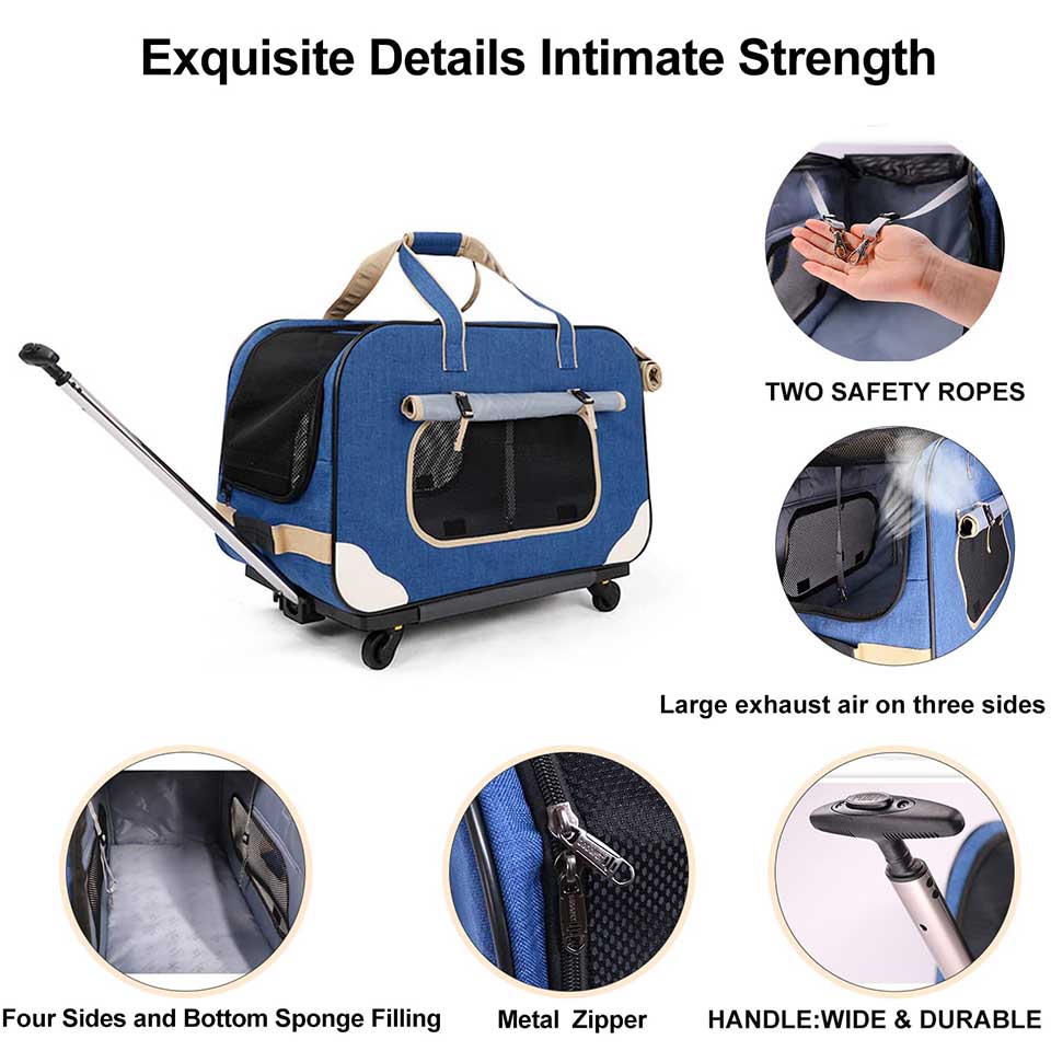The pet carrier has telescoping handle with wheels, to function as a rolling case. Can be used as a backpack, tote, carrier, or car seat. Comes with removable plush pad for easy washing, tether to secure animal, and wheel cover. Provided your pet fits into the dimensions of the product comfortably when fully assembled, this item will support the weight of your pet. For small pets only - read sizing dimensions of product carefully.