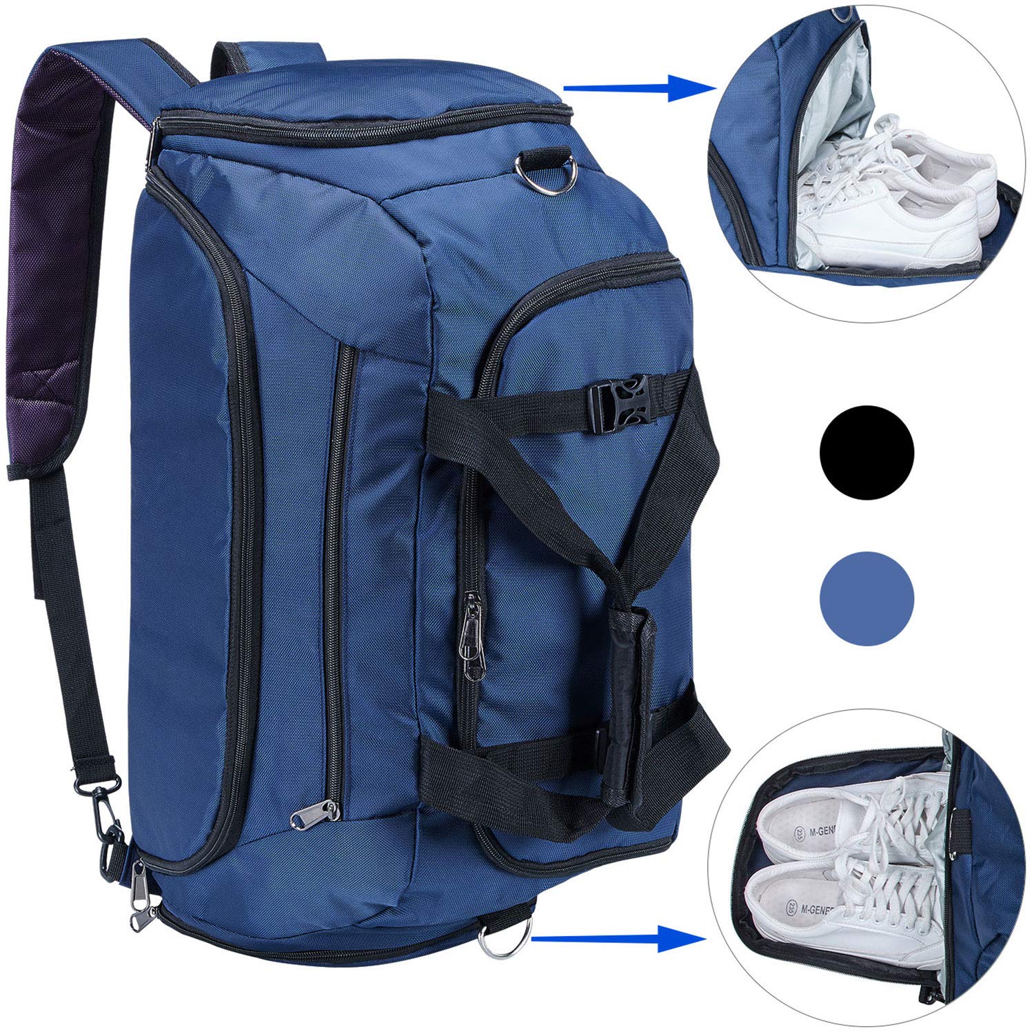 • [3 WAYS OF CARRYING]: The travel duffel backpack is multifunction, you can use the gym sports bag as a duffle bag, shoulder bag or backpack.Two padded straps in the hidden compartment make this bag as a backpack . A detachable shoulder strap can easily turn the backpack into a shoulder bag.