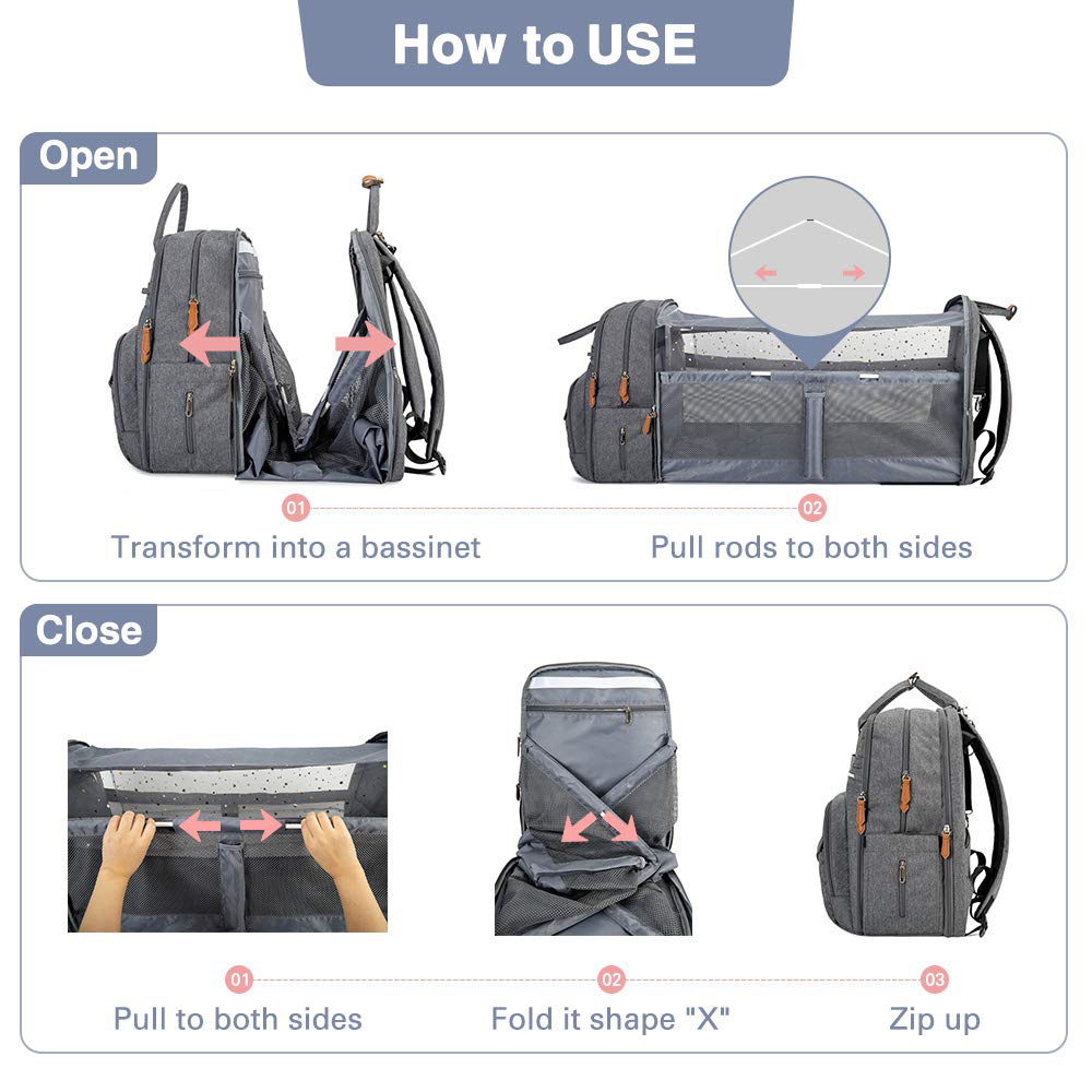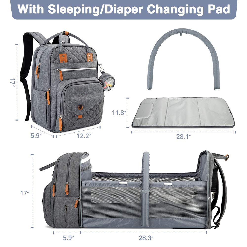 * All in One Diaper Bag: The baby diaper bag backpack converts easily into a baby travel bassinet with shade cloth and toy bar,
