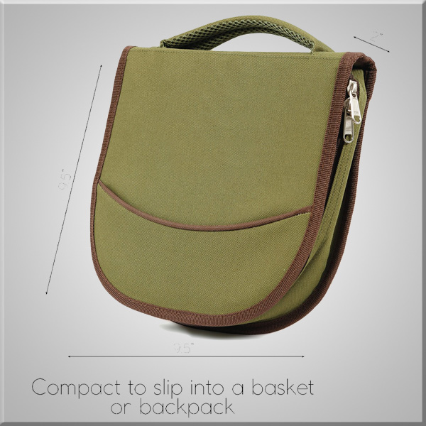 MATERIAL: Acceptance of a dense 600D Oxford cloth, strong and wearable. Made of PEVA material, the PEVA food compartment inside, through the LFGB food safety test, insulation preservation. TABLEWARE PACKAGING FOR TWO: Ideal to cater for 2 people and includes all the essential flatware items needed for a small picnic - 2x stainless steel knives, forks, spoons, dinner plates, cotton napkins, plastic wine glasses,salt and pepper shaker and 1x bottle opener, cheese/butter knife,plastic chopping board.PERFECT FOR TRAVEL: There are two compartments accessed via zip on both sides of the bag. Well-made adjustable shoulder strap for transporting your favourite drinks in elegance.LARGE SPACE: .Large enough to accommodate picnic essentials for the entire family, and small enough not to cause trouble, ideal for camping, hiking, barbecue, etc.