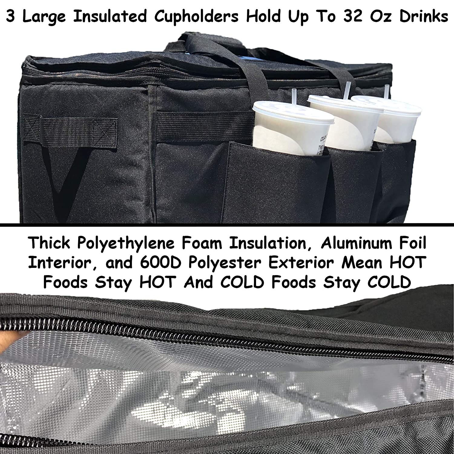1.PREMIUM QUALITY BAG- Our insulated bags are made with high quality polyester fabric, extra thick PE foam insulation,aluminum foil liner, and the highest end YKK zippers to ensure a long lasting, sturdy bag that keeps your food hot OR cold longer! 2.VERSATILE BAG FOR MANY USES - This bag is perfect for food delivery services as well as restaurants and professional caterers. Keep one in your car for going to the grocery store or use for picnics! 3.XXL EXTRA LARGE SUPER SPACIOUS SIZE - 23"x14"x15"Caterers: Plenty of room to carry up to 4 full size steam table pans or a combination of full size and smaller pans. 4.Food delivery: Use the TWO INCLUDED DIVIDERS to split up multiple delivery orders!