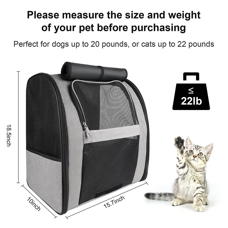 * LARGE SIZE - Measures approximately 15.7*10*18.5inch (L x W x H). This pet backpack carrier is designed for small and medium sized dogs weighing up to 20 lbs.; cat, rabbit and other small animal up to 22 lbs. (NOTE: Please measure the size and weight of your cat dog before purchasing this product, do not select the backpack size based on weight only, please reference your pet's length and height in selecting a backpack size). LENGTH: neck to base of tail; HEIGHT: floor to top of shoulder.
