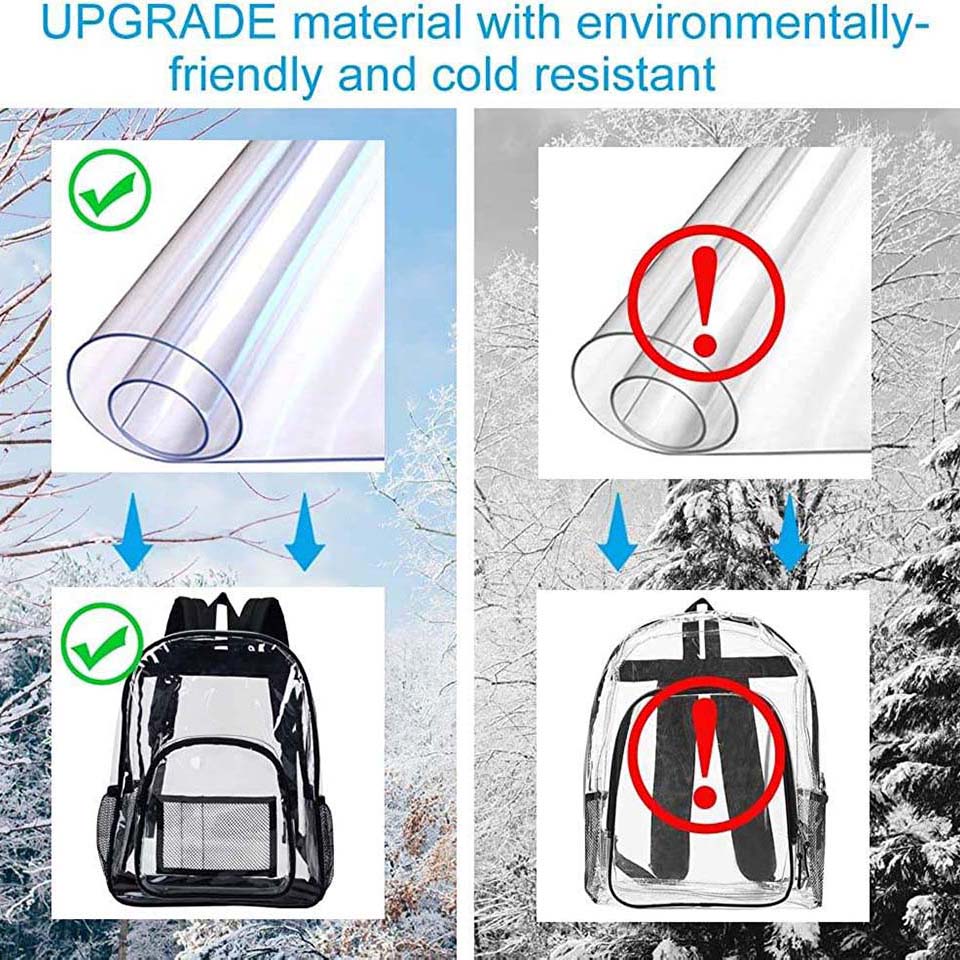 * 16" shoulder drop * 【UPGRADE MATERIAL】- The material of this transparent bag is customized by environmentally-friendly and cold resistant, It is safe for your health and you don't worry it will crack in cold winter. * 【REINFORCED BASE】- Reinforced the material under bottom, improve the bottom corner of the book bag ripped apart problem. * 【STADIUM APPROVED CLEAR BACKPACK】-Made of heavy duty 0.3 mm Clear PVC,Transparent Backpack with Completely see through all around, including back. * 【GET THROUGH SECURITY HASSLE- FREE】-Take this amazing, see-through backpack to all your football matches, sports games, concerts, parties and festivals with peace of mind. * 【LARGE CAPACITY】-With a large main compartment, as well as a spacious front zipper pocket for easy access to your most frequently used accessories and two mesh side pockets perfect. |