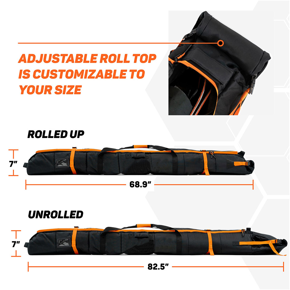 Ski Bag: One size fits up to 200cm skis with a cushioned adjustable roll top. Safely secured with clips to hold firm. Length is 177cm (rolled) to 210cm (unrolled). Internal webbing to hold skis. Create a stable spine for the bag that does not move so you can arrange all your other gear around it safely.