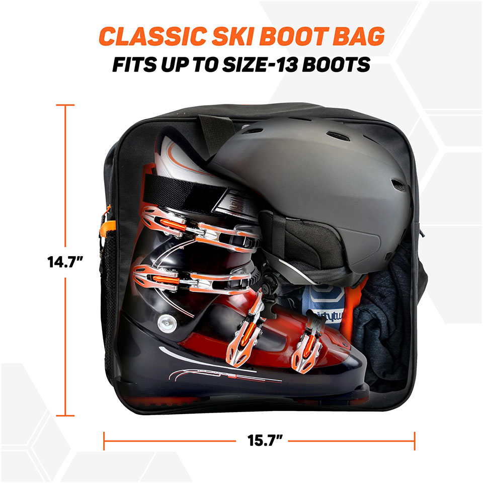 Boot Bag: Fits up to USA size 13 boots with plenty of room for a helmet, clothes, and other gear. Includes adjustable shoulder carry strap with shoulder pad, side mesh pocket, and reinforced handles.