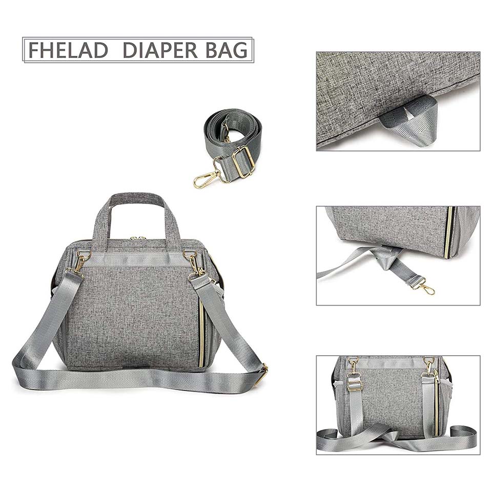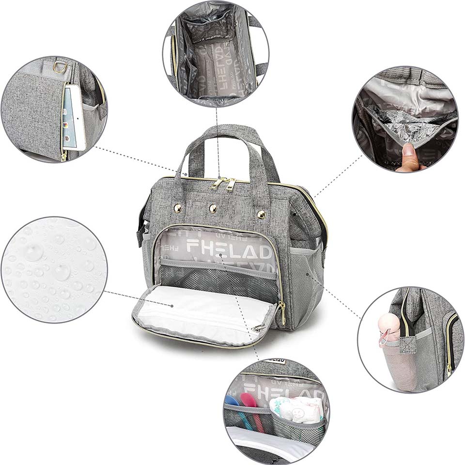 Pattern Type: grey Style: Single Package Material: Polyester, nylon 210D lining Brand Name: customized Feature: with USB, Anti-Theft Description: diaper bed bag Color: customized Dimension: 11.8*7.8*16.5inchor Customized Certificate: BSCI,Sedex,TUV,ISO9001 Sample time: 5-7 Days Sample charges: USD50 Warranty: 1 year against defect of materials and manufacturing OEM/ODM: Availalble Logo: Accept Customized Logo