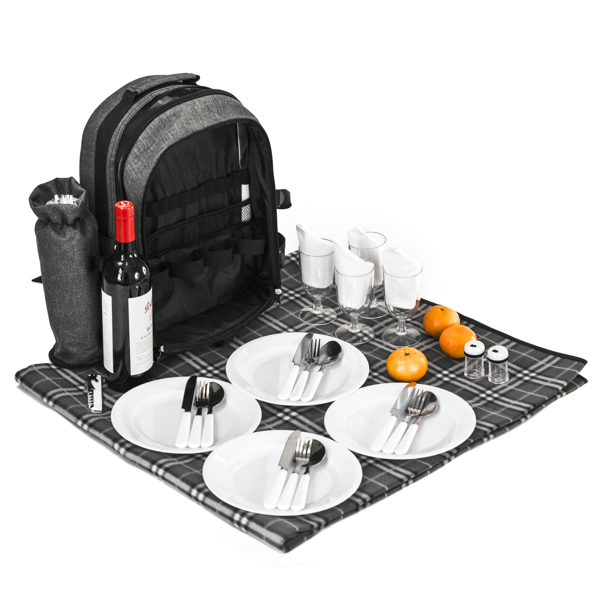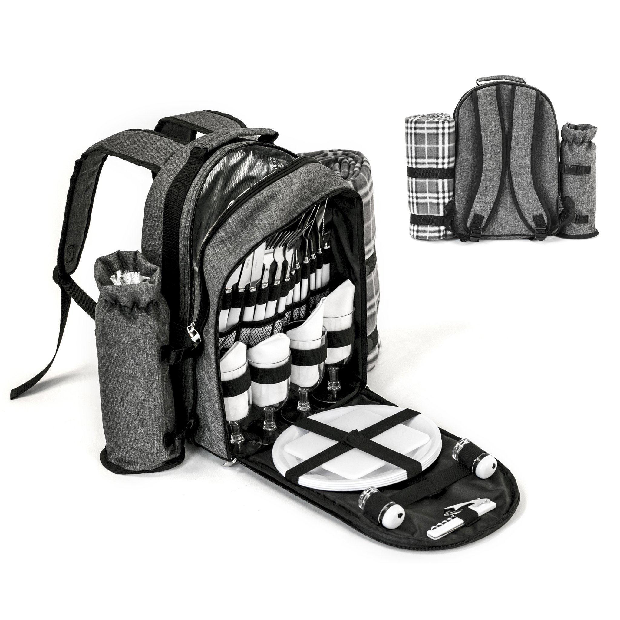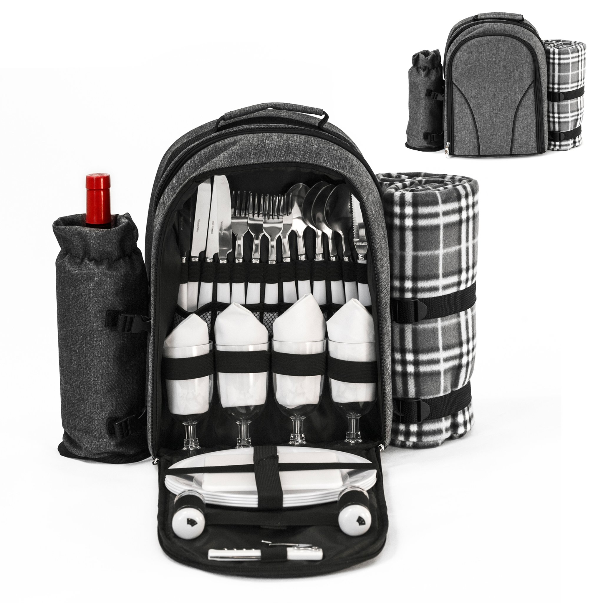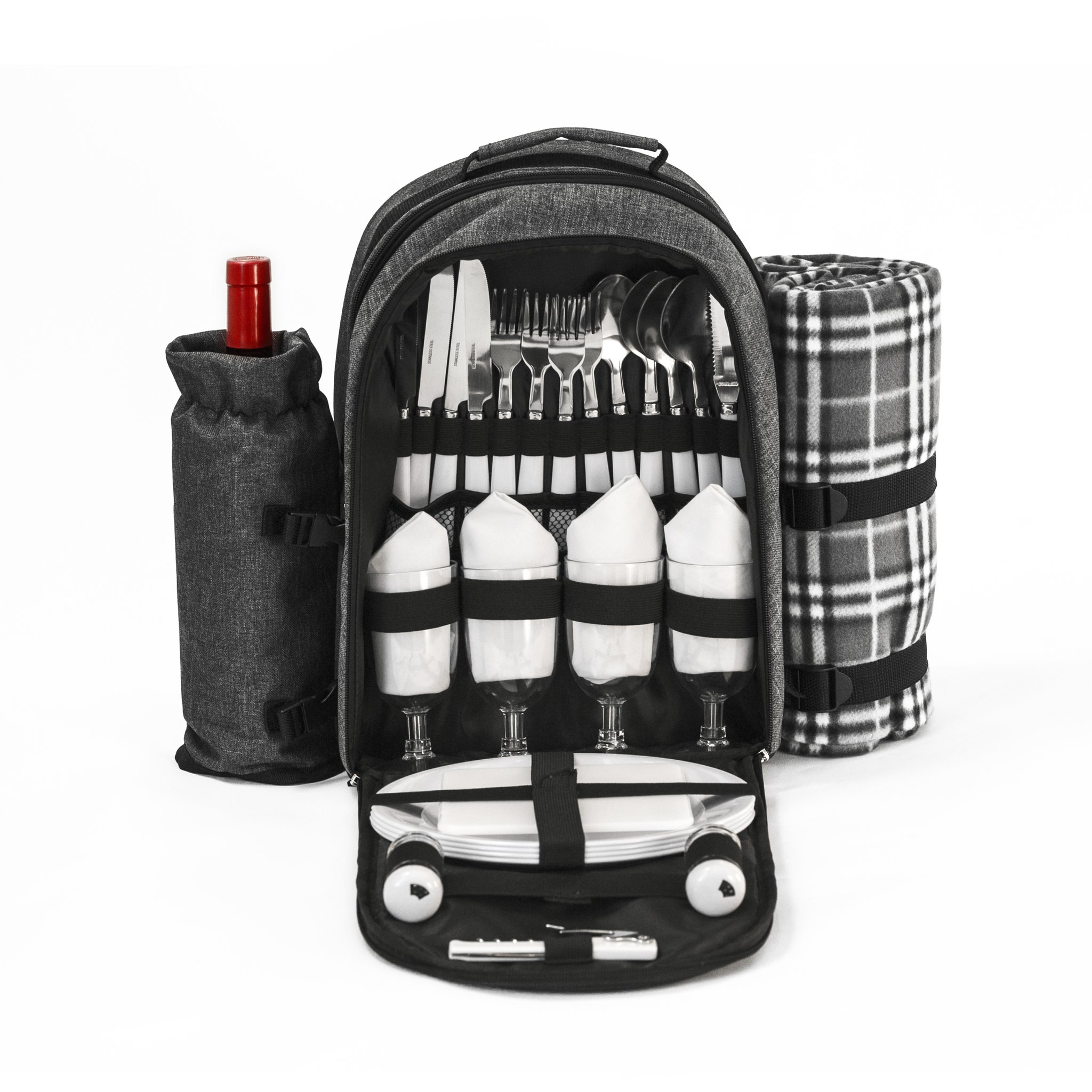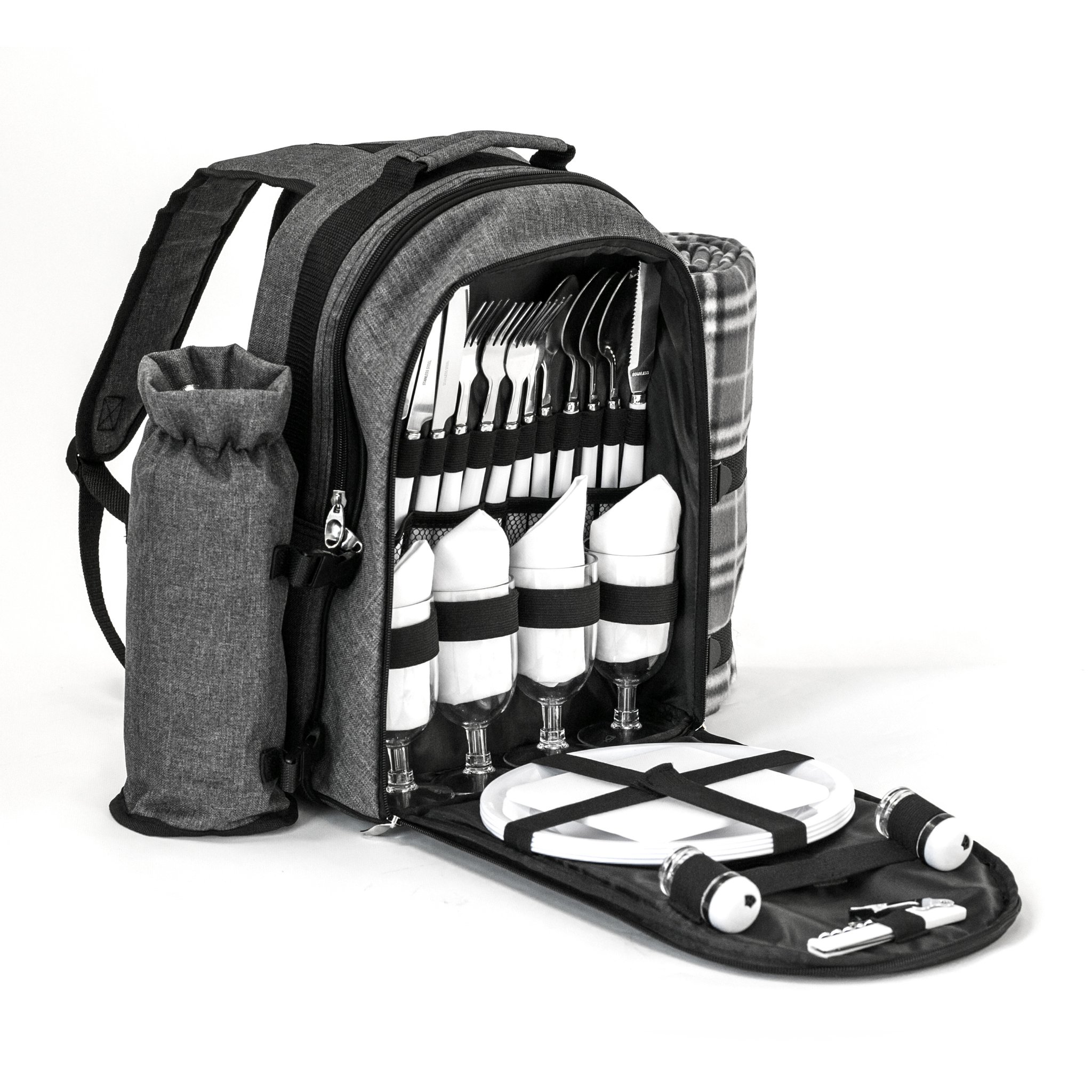ALL ESSENTIALS PICNIC ACCESSORIES INCLUDED: Backpack includes: 4 stainless steel utensils with plastic handle (4 knifes, 4 forks, 4 spoons), 4 plastic dinner plates, 4 cotton napkins, 4 plastic wine glasses, 1 bottle opener/corkscrew. Extra accessories included: 2 salt and pepper shakers, 1 cheese knife and 1 plastic chopping board perfect for cutting cheese, bread, fruits, sandwiches, etc All plastics are BPA free