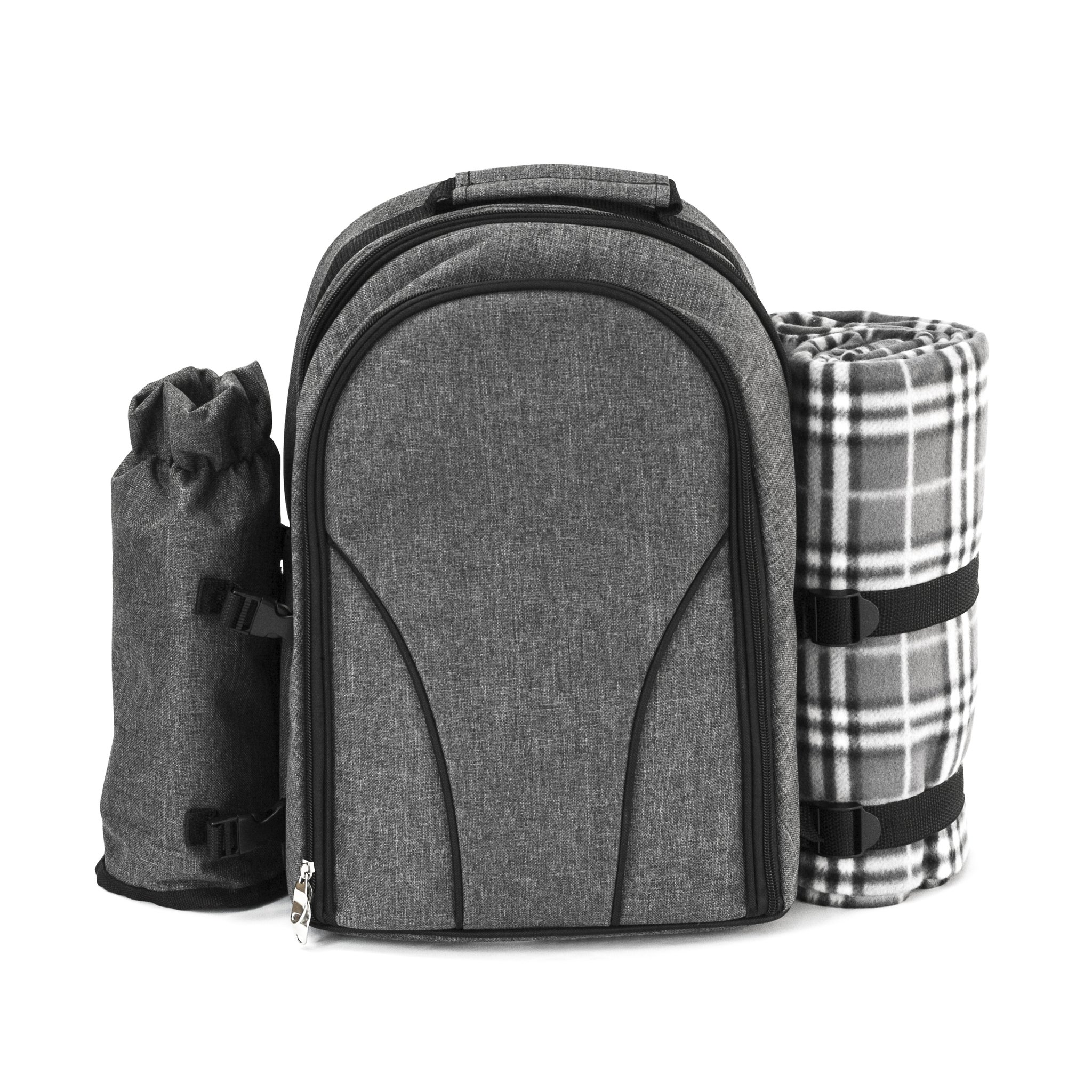 MATERIAL: Acceptance of a dense 600D Oxford cloth, strong and wearable. Made of PEVA material, the PEVA food compartment inside, through the LFGB food safety test, insulation preservation. TABLEWARE PACKAGING FOR TWO: Ideal to cater for 2 people and includes all the essential flatware items needed for a small picnic - 2x stainless steel knives, forks, spoons, dinner plates, cotton napkins, plastic wine glasses,salt and pepper shaker and 1x bottle opener, cheese/butter knife,plastic chopping board.PERFECT FOR TRAVEL: There are two compartments accessed via zip on both sides of the bag. Well-made adjustable shoulder strap for transporting your favourite drinks in elegance.LARGE SPACE: .Large enough to accommodate picnic essentials for the entire family, and small enough not to cause trouble, ideal for camping, hiking, barbecue, etc.
