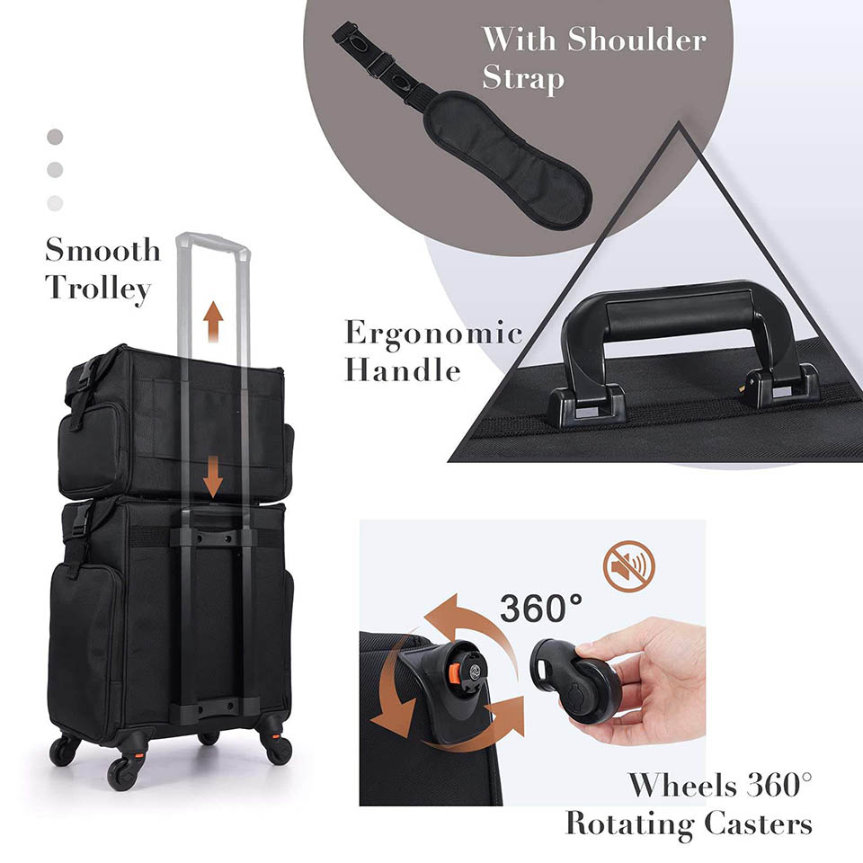 * 【2 IN 1 Makeup Trolley Set】: The top train case can be attached to the rolling cosmetic suitcase as a large makeup station, or both of these makeup cases can be used separately. You will receive a handbag/shoulder bag with shoulder strap, a soft-sided rolling luggage on wheels